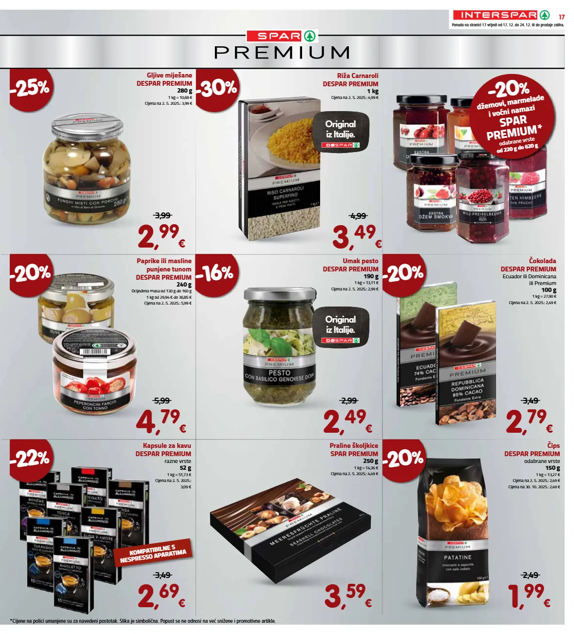 2 , 49 € 2,99 2 , 79 € 3,49 4 , 79 € 5,99 2 , 99 € 3,99 2 , 69 € 3,49 1 , 99 € 2,49 3 , 59 € 3 , 49 € 4,99 -30 % -22 % -20 % -16 % -20 % -20 % -25 % umak pesto despar premium 190 g 1 kg = 13,11 € cijena na 2. 5. 2025.: 2,99 € čokolada despar premium ecuador ili dominicana ili premium 100 g 1 kg = 27,90 € cijena na 2. 5. 2025.: 2,49 € paprike ili masline punjene tunom despar premium 240 g ocijeđena masa od 130 g do 160 g 1 kg od 29,94 € do 36,85 € cijena na 2. 5. 2025.: 5,99 € gljive miješane despar premium 280 g 1 kg = 10,68 € cijena na 2. 5. 2025.: 3,99 € kapsule za kavu despar premium razne vrste 52 g 1 kg = 51,73 € cijena na 2. 5. 2025.: 3,09 € čips despar premium odabrane vrste 150 g 1 kg = 13,27 € cijena na 2. 5. 2025.: 2,49 € cijena na 30. 10. 2025.: 2,49 € praline školjkice spar premium 250 g 1 kg = 14,36 € cijena na 2. 5. 2025.: 4,49 € riža carnaroli despar premium 1 kg cijena na 2. 5. 2025.: 4,99 € kompatibilne s nespresso aparatima -20 % džemovi, marmelade i voćni namazi spar premium* odabrane vrste od 220 g do 620 g original iz italije. original iz italije. ponuda na stranici 17 vrijedi od x. x. do x. x. ili do prodaje zalih 17 ponuda na stranici 17 vrijedi od 17. 12. do 24. 12. ili do prodaje zaliha. *cijene na polici umanjene su za navedeni postotak. slika je simbolična. popust se ne odnosi na već snižene i promotivne artikle.