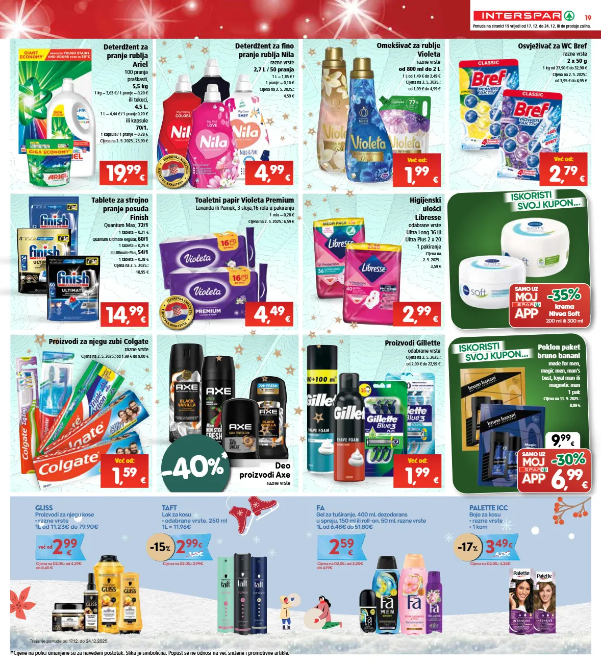 cijena na 02.05.: od 4,29€ do 8,45 € € 2 99 gliss proizvodi za njegu kose · razne vrste 1l od 11,23€ do 79,90€ već od cijena na 02.05.: od 3,20€ do 4,19€ € 2 59 fa gel za tuširanje, 400 ml, dezodorans u spreju, 150 ml ili roll-on, 50 ml, razne vrste 1l od 6,48€ do 51,80€ cijena na 02.05.: 2,99€ taft lak za kosu · odabrane vrste, 250 ml 1l = 11,96€ 2 99 3,55€ € -15 % cijena na 02.05.: 4,25€ palette icc boje za kosu · razne vrste · 1 kom 3 49 4,25€ € -17 % trajanje ponude od 17.12. do 24.12.2025. deo proizvodi axe razne vrste -40 % * *cijene na polici umanjene su za navedeni postotak. slika je simbolična. popust se ne odnosi na već snižene i promotivne artikle. deterdžent za fino pranje rublja nila razne vrste 2,7 l / 50 pranja 1 l = 1,85 € / 1 pranje = 0,10 € cijena na 2. 5. 2025.: 4,59 € h r v a t s k a k v a l i t e t a h r v a t s k a k v a l i t e t a h r v a t s k a k v a l i t e t a h r v a t s k a k v a l i t e t a osvježivač za wc bref razne vrste 2 x 50 g 1 kg od 27,90 € do 32,90 € cijena na 2. 5. 2025.: od 3,95 € do 4,95 € deterdžent za pranje rublja ariel 100 pranja praškasti, 5,5 kg 1 kg = 3,63 € / 1 pranje = 0,20 € ili tekuci, 4,5 l, 1 l = 4,44 € / 1 pranje 0,20 € ili kapsule 70/1, 1 kapsula / 1 pranje = 0,28 € cijena na 2. 5. 2025.: 23,99 € 19 , 99 € 4 , 99 € tablete za strojno pranje posuđa finish quantum max, 72/1 1 tableta = 0,21 € quantum ultimate regular, 60/1 1 tableta = 0,25 € ili ultimate plus, 54/1 1 tableta = 0,28 € cijena na 2. 5. 2025.: 18,95 € proizvodi za njegu zubi colgate razne vrste cijena na 2. 5. 2025.: od 1,99 € do 9,00 € toaletni papir violeta premium lavanda ili pamuk, 3 sloja,16 rola u pakiranju 1 rola = 0,28 € cijena na 2. 5. 2025.: 6,59 € omekšivač za rublje violeta razne vrste od 800 ml do 2 l 1 l od 1,49 € do 2,49 € cijena na 2. 5. 2025.: od 1,99 € do 4,99 € higijenski ulošci libresse odabrane vrste ultra long 36 ili ultra plus 2 x 20 1 pakiranje cijena na 2. 5. 2025.: 3,59 € iskoristi svoj kupon... iskoristi svoj kupon... poklon paket bruno banani made for men, magic men, man’s best, loyal man ili magnetic man 1 pak cijena na 11. 9. 2025.: 8,99 € 9 , 99 € samo uz 6 , 99 € -30% -30% samo uz -35% -35% krema nivea soft 200 ml ili 300 ml 1 , 99 € već od: 2 , 79 € već od: 14 , 99 € 2 , 99 € 4 , 49 € proizvodi gillette odabrane vrste cijena na 2. 5. 2025.: od 2,09 € do 22,99 € 1 , 99 € već od: 1 , 59 € već od: ponuda na stranici 19 vrijedi od x. x. do x. x. ili do prodaje zalih ponuda na stranici 19 vrijedi od 6. 11. do 12. 11. ili do prodaje zaliha. 19 19 ponuda na stranici 19 vrijedi od 17. 12. do 24. 12. ili do prodaje zaliha.