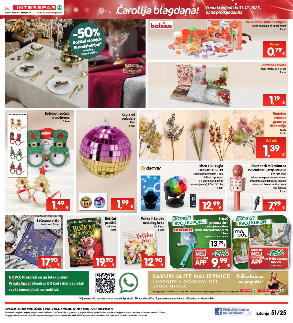 sakupl ja jte nal jepnice i u r o n i t e u o č a r a v a j u ć i s v i j e t m i r i s a prilika koja se ne propušta! sakupljajte naljepnice u razdoblju od 5.11.2025. do 6.1.2026. iskoristite sakupljene naljepnice do 13.1.2026. ili do prodaje zaliha. *cijene na polici umanjene su za navedeni postotak. slika je simbolična. popust se ne odnosi na već snižene i promotivne artikle. umjetno cvijeće i grane za dekoraciju razno 1 kom božićne naočale s motivima 1 kom disco led kugla denver ldb-319 s rotirajućim svjetlom u boji, daljinski upravljač, 3 x veličine aa baterije (nisu uključene) ili 5v usb ulaz 1 kom bluetooth mikrofon sa zvučnikom setty bm-100 3 w, aux izlaz, jednostavno povezivanje s raznim uređajima, za organizaciju karaoke zabava na otvorenom i kod kuće, eho funkcija 1 kom začarane priče tvrdi uvez, 1 kom božićni praščić tvrdi uvez 1 kom velika frka oko nestalog brka tvrdi uvez 1 kom kugla od ogledala 8 cm 1 kom veliki izbor bolsius svijeća razna pakiranja, sa ili bez mirisa 1 kom božićne salvete razni motivi, 33 x 33 cm 1 kom 1 , 49 € 1 , 99 € 1 , 19 € 19 , 90 € 12 , 90 € 17 , 90 € 7 , 99 € 12 , 99 € također u ponudi iskoristi svoj kupon... iskoristi svoj kupon... 13 , 79 € samo uz 9 , 99 € -27% -27% brisač prozora 2u1 s rotacijskom ručkom dužina gume za brisanje 28 cm 1 kom cijena na 2. 5. 2025.: 13,79 € samo uz -25% -25% na liniju posuđa moods razne vrste -50 % božićni stolnjak ili nadstolnjak* razne boje, dezeni i veličine ponuda na stranici 24 vrijedi od x. x. do x. x. ili do prodaje zaliha. ponuda na stranici 24 vrijedi od 17. 12. do 31. 12. ili do prodaje zaliha. 24 izdanje 51/25 poπtovani kupci! prituæbe i pohvale besplatni telefon 0800 7727 info@spar.hr proizvode iz ovog letka moguće je kupiti samo u količinama za kućanstvo! ne odgovaramo za moguće tiskarske greške! izraženi postotak sniženja je minimalan. sve cijene su izražene u eurima s pdv-om. zbog ograničenosti prostora svi artikli iz neprehrambenog asortimana nisu dostupni u interspar hipermarketima u samoboru, puli, zadru, ante starčevića 5a i osijeku - portanova pridružite nam se na facebooku čarolija blagdana! ponuda vrijedi do 31. 12. 2025. ili do prodaje zaliha 1 , 39 € već od: 0 , 79 € već od: