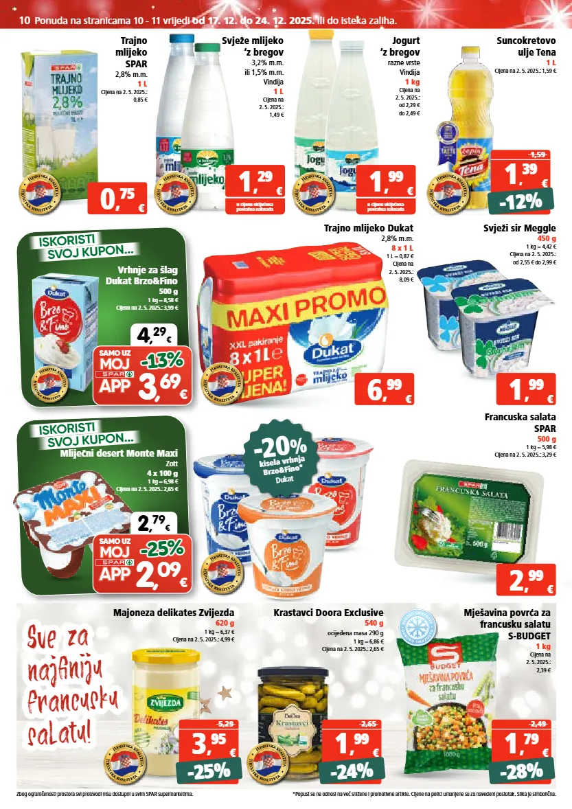 sve za sve za najfiniju najfiniju francusku francusku salatu! salatu! -28% -28% 2,49 € 1 , 79 79 -24% -24% 2,65 € 1 , 99 99 -25% -25% 5,29 € 3 , 95 95 -12% -12% 1,59 € 1 , 3 39 9 krastavci doora exclusive 540 g ocijeđena masa 290 g 1 kg = 6,86 € cijena na 2. 5. 2025.: 2,65 € mješavina povrća za francusku salatu s-budget 1 kg cijena na 2. 5. 2025.: 2,39 € majoneza delikates zvijezda 620 g 1 kg = 6,37 € cijena na 2. 5. 2025.: 4,99 € h r v a t s k a k v a l i t e t a h r v a t s k a k v a l i t e t a h r v a t s k a k v a l i t e t a h r v a t s k a k v a l i t e t a h r v a t s k a k v a l i t e t a h r v a t s k a k v a l i t e t a h r v a t s k a k v a l i t e t a h r v a t s k a k v a l i t e t a h r v a t s k a k v a l i t e t a h r v a t s k a k v a l i t e t a h r v a t s k a k v a l i t e t a h r v a t s k a k v a l i t e t a h r v a t s k a k v a l i t e t a h r v a t s k a k v a l i t e t a h r v a t s k a k v a l i t e t a h r v a t s k a k v a l i t e t a 2 , 79 € 4 , 29 € iskoristi svoj kupon... iskoristi svoj kupon... samo uz samo uz 2 , 09 € 3 , 69 € -25% -25% -13% -13% vrhnje za šlag dukat brzo&fino 500 g 1 kg = 8,58 € cijena na 2. 5. 2025.: 3,99 € mliječni desert monte maxi zott 4 x 100 g 1 kg = 6,98 € cijena na 2. 5. 2025.: 2,65 € h r v a t s k a k v a l i t e t a h r v a t s k a k v a l i t e t a trajno mlijeko spar 2,8% m.m. 1 l cijena na 2. 5. 2025.: 0,85 € svježe mlijeko ‘z bregov 3,2% m.m. ili 1,5% m.m. vindija 1 l cijena na 2. 5. 2025.: 1,49 € jogurt ‘z bregov razne vrste vindija 1 kg cijena na 2. 5. 2025.: od 2,29 € do 2,49 € suncokretovo ulje tena 1 l cijena na 2. 5. 2025.: 1,59 € trajno mlijeko dukat 2,8% m.m. 8 x 1 l 1 l = 0,87 € cijena na 2. 5. 2025.: 8,09 € svježi sir meggle 450 g 1 kg = 4,42 € cijena na 2. 5. 2025.: od 2,55 € do 2,99 € francuska salata spar 500 g 1 kg = 5,98 € cijena na 2. 5. 2025.: 3,29 € € 0 , 75 75 € 1 , 9 99 9 € 6 , 99 99 € 2 , 99 99 - 20 % kisela vrhnja brzo&fino* dukat € 1 , 2 29 9 u cijenu uključena povratna naknada € 1 , 9 99 9 u cijenu uključena povratna naknada zbog ograničenosti prostora svi proizvodi nisu dostupni u svim spar supermarketima. 10 ponuda na stranicama 10 - 11 vrijedi od 17. 12. do 24. 12. 2025. ili do isteka zaliha. *popust se ne odnosi na već snižene i promotivne artikle. cijene na polici umanjene su za navedeni postotak. slika je simbolična.