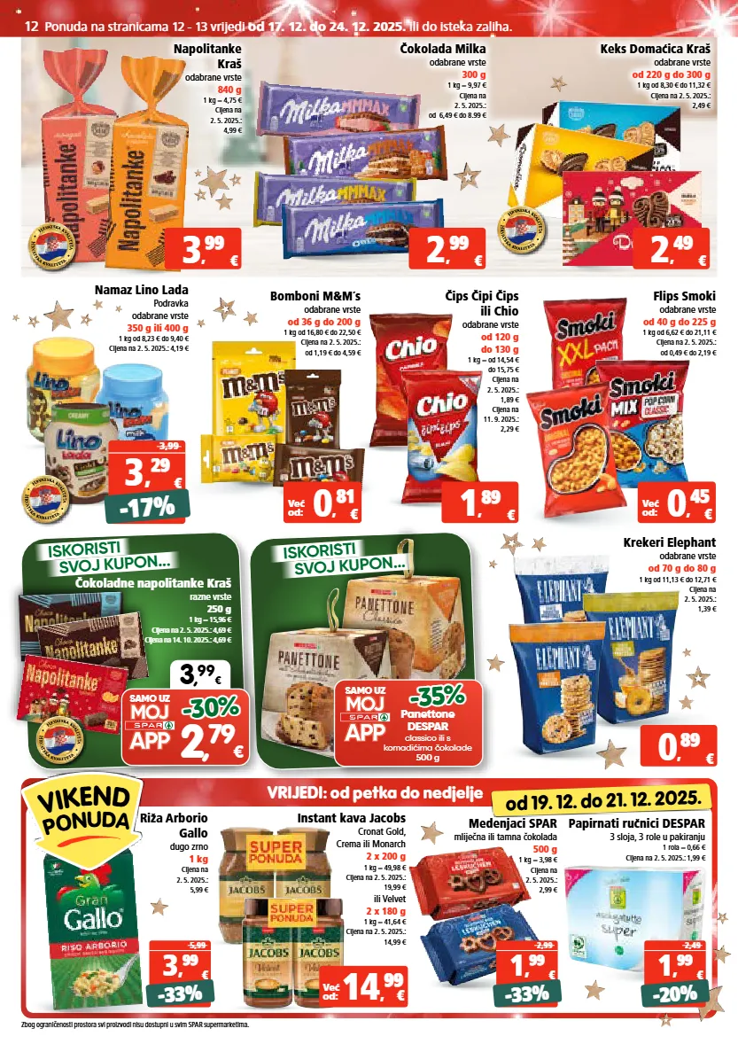 od 19. 12. do 21. 12. 2025. vrijedi: od petka do nedjelje 3 , 99 € iskoristi svoj kupon... samo uz 2 , 79 € -30% -30% iskoristi svoj kupon... samo uz -35% -35% panettone despar classico ili s komadićima čokolade 500 g čokoladne napolitanke kraš razne vrste 250 g 1 kg = 15,96 € cijena na 2. 5. 2025.: 4,69 € cijena na 14. 10. 2025.: 4,69 € već od: € 0 , 81 81 već od: € 0 , 45 45 -33% -33% 5,99 € 3 , 9 99 9 -20% -20% 2,49 € 1 , 99 99 -33% -33% 2,99 € 1 , 99 99 krekeri elephant odabrane vrste od 70 g do 80 g 1 kg od 11,13 € do 12,71 € cijena na 2. 5. 2025.: 1,39 € flips smoki odabrane vrste od 40 g do 225 g 1 kg od 6,62 € do 21,11 € cijena na 2. 5. 2025.: od 0,49 € do 2,19 € čips čipi čips ili chio odabrane vrste od 120 g do 130 g 1 kg = od 14,54 € do 15,75 € cijena na 2. 5. 2025.: 1,89 € cijena na 11. 9. 2025.: 2,29 € bomboni m&m´s odabrane vrste od 36 g do 200 g 1 kg od 16,80 € do 22,50 € cijena na 2. 5. 2025.: od 1,19 € do 4,59 € riža arborio gallo dugo zrno 1 kg cijena na 2. 5. 2025.: 5,99 € instant kava jacobs cronat gold, crema ili monarch 2 x 200 g 1 kg = 49,98 € cijena na 2. 5. 2025.: 19,99 € ili velvet 2 x 180 g 1 kg = 41,64 € cijena na 2. 5. 2025.: 14,99 € medenjaci spar mliječna ili tamna čokolada 500 g 1 kg = 3,98 € cijena na 2. 5. 2025.: 2,99 € papirnati ručnici despar 3 sloja, 3 role u pakiranju 1 rola = 0,66 € cijena na 2. 5. 2025.: 1,99 € keks domaćica kraš odabrane vrste od 220 g do 300 g 1 kg od 8,30 € do 11,32 € cijena na 2. 5. 2025.: 2,49 € čokolada milka odabrane vrste 300 g 1 kg = 9,97 € cijena na 2. 5. 2025.: od 6,49 € do 8.99 € napolitanke kraš odabrane vrste 840 g 1 kg = 4,75 € cijena na 2. 5. 2025.: 4,99 € h r v a t s k a k v a l i t e t a h r v a t s k a k v a l i t e t a € 2 , 9 99 9 € 3 , 9 99 9 € 0 , 8 89 9 € 1 , 8 89 9 € 2 , 4 49 9 h r v a t s k a k v a l i t e t a h r v a t s k a k v a l i t e t a h r v a t s k a k v a l i t e t a h r v a t s k a k v a l i t e t a v i k e n d p o n u d a već od: € 14 , 99 99 -17% -17% 3,99 € 3 , 2 29 9 namaz lino lada podravka odabrane vrste 350 g ili 400 g 1 kg od 8,23 € do 9,40 € cijena na 2. 5. 2025.: 4,19 € h r v a t s k a k v a l i t e t a h r v a t s k a k v a l i t e t a zbog ograničenosti prostora svi proizvodi nisu dostupni u svim spar supermarketima. 12 ponuda na stranicama 12 - 13 vrijedi od 17. 12. do 24. 12. 2025. ili do isteka zaliha.