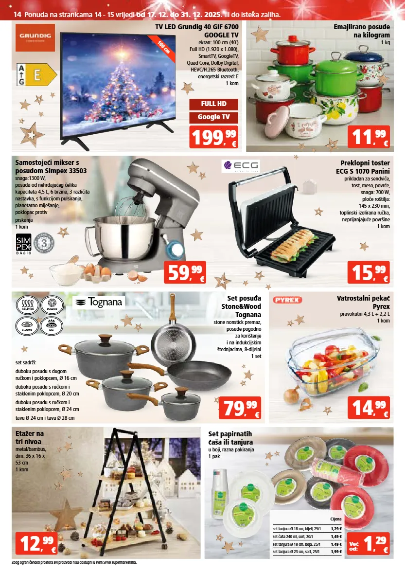 set papirnatih čaša ili tanjura u boji, razna pakiranja 1 pak € 79 , 99 99 € 12 , 99 99 € 15 , 99 99 € 14 , 99 99 € 59 , 99 99 € 199 , 99 99 € 11 , 99 99 već od: € 1 , 29 29 set posuđa stone&wood tognana stone nonstick premaz, posuđe pogodno za korištenje i na indukcijskim štednjacima, 8-dijelni 1 set vatrostalni pekač pyrex pravokutni 4,3 l + 2,2 l 1 kom samostojeći mikser s posudom simpex 33503 snaga:1300 w, posuda od nehrđajućeg čelika kapaciteta 4,5 l, 6 brzina, 3 različita nastavka, s funkcijom pulsiranja, planetarno miješanje, poklopac protiv prskanja 1 kom etažer na tri nivoa metal/bambus, dim: 36 x 16 x 53 cm 1 kom preklopni toster ecg s 1070 panini prikladan za sendviče, tost, meso, povrće, snaga: 700 w, ploče roštilja: 145 x 230 mm, toplinski izolirana ručka, neprijanjajuće površine 1 kom tv led grundig 40 gif 6700 google tv ekran: 100 cm (40¨) full hd (1.920 x 1.080), smarttv, googletv, quad core, dolby digital, hevc/h.265 bluetooth, energetski razred: e 1 kom set sadrži: duboku posudu s dugom ručkom i poklopcem, ø 16 cm duboku posudu s ručkom i staklenim poklopcem, ø 20 cm duboku posudu s ručkom i staklenim poklopcem, ø 24 cm tavu ø 24 cm i tavu ø 28 cm emajlirano posuđe na kilogram 1 kg 100 cm google tv full hd cijena set tanjura ø 18 cm, bijeli, 25/1 1,29 € set čaša 240 ml, sort, 20/1 1,49 € set tanjura ø 18 cm, boja, 25/1 1,49 € set tanjura ø 23 cm, sort, 25/1 1,99 € zbog ograničenosti prostora svi proizvodi nisu dostupni u svim spar supermarketima. 14 ponuda na stranicama 14 - 15 vrijedi od 17. 12. do 31. 12. 2025. ili do isteka zaliha.