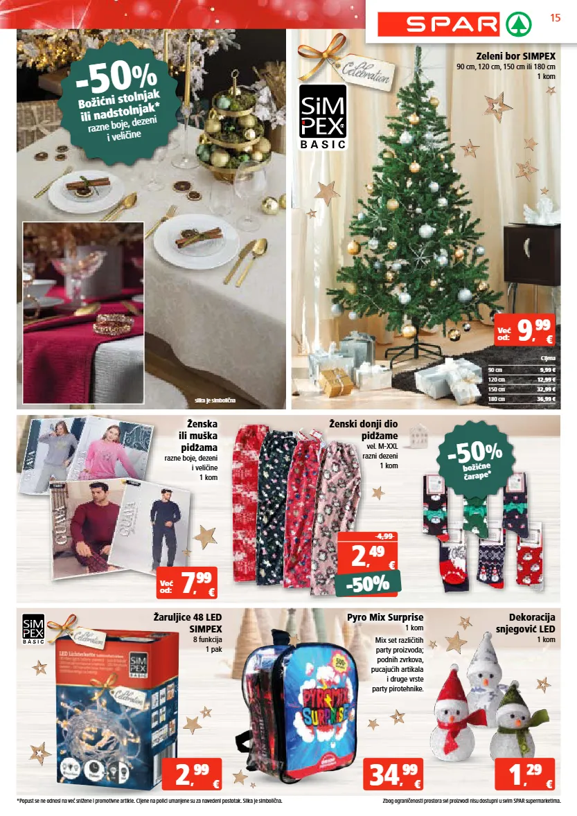 -50% -50% 4,99 € 2 , 49 49 - 50 % božićne čarape* - 50 % božićni stolnjak ili nadstolnjak* razne boje, dezeni i veličine ženska ili muška pidžama razne boje, dezeni i veličine 1 kom slika je simbolična ženski donji dio pidžame vel. m-xxl razni dezeni 1 kom dekoracija snjegović led 1 kom pyro mix surprise 1 kom mix set različitih party proizvoda; podnih zvrkova, pucajućih artikala i druge vrste party pirotehnike. žaruljice 48 led simpex 8 funkcija 1 pak zeleni bor simpex 90 cm, 120 cm, 150 cm ili 180 cm 1 kom € 2 , 99 99 € 34 , 99 99 € 1 , 29 29 već od: € 7 , 99 99 već od: € 9 , 99 99 cijena 90 cm 9,99 € 120 cm 12,99 € 150 cm 32,99 € 180 cm 36,99 € 15 *popust se ne odnosi na već snižene i promotivne artikle. cijene na polici umanjene su za navedeni postotak. slika je simbolična. zbog ograničenosti prostora svi proizvodi nisu dostupni u svim spar supermarketima.