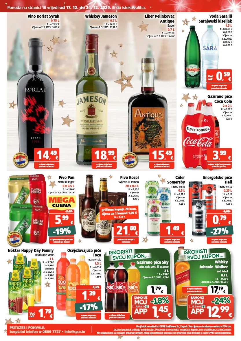 već od: € 1 , 79 79 liker pelinkovac antique badel 0,7 l 1 l = 22,13 € cijena na 2. 5. 2025.: 15,49 € whiskey jameson 0,7 l 1 l = 27,13 € cijena na 2. 5. 2025.: 23,32 € vino korlat syrah 0,75 l 1 l = 19,32 € cijena na 2. 5. 2025.: 16,02 € pivo kozel svijetlo ili tamno 20 x 0,5 l 1 l = 2,50 € cijena na 2. 5. 2025.: 1,25 € nektar happy day family odabrane vrste 1 l 1 l od 1,79 € do 1,99 € cijena na 2. 5. 2025.: od 1,99 € do 2,39 € osvježavajuće piće toco razne vrste 1,5 l 1 l = 0,93 € cijena na 2. 5. 2025.: 1,69 € pivo pan zlatni ili lager 6 x 0,5 l 1 l = 2,00 € cijena na 2. 5. 2025.: 7,47 € cider somersby razne vrste 0,5 l 1 l = 2,98 € cijena na 2. 5. 2025.: 1,88 € voda sara ili sarajevski kiseljak 1,5 l 1 l od 0,39 € do 0,50 € cijena na 2. 5. 2025.: od 0,82 € do 0,88 € gazirano piće coca cola 2 x 2 l 1 l = 1,00 € cijena na 2. 5. 2025.: 3,99 € energetsko piće hell razne vrste 0,25 l 1 l = 3,16 cijena na 2. 5. 2025.: 1,25 € € 21 , 80 80 povratna kaucijska ambalaža € 14 , 49 49 u cijenu uključena povratna naknada € 15 , 49 49 u cijenu uključena povratna naknada € 18 , 9 99 9 u cijenu uključena povratna naknada € 1 , 49 49 u cijenu uključena povratna naknada € 3 , 9 99 9 u cijenu uključena povratna naknada po boci u cijenu uključena povratna naknada u cijenu uključena povratna naknada -27% -27% 1,09 € 0 , 79 79 u cijenu uključena povratna naknada -17% -17% 1,69 € 1 , 39 39 u cijenu uključena povratna naknada u cijenu uključena povratna naknada već od: € 0 , 59 59 h r v a t s k a k v a l i t e t a h r v a t s k a k v a l i t e t a h r v a t s k a k v a l i t e t a h r v a t s k a k v a l i t e t a h r v a t s k a k v a l i t e t a h r v a t s k a k v a l i t e t a iskoristi svoj kupon... iskoristi svoj kupon... 1 , 79 € samo uz 1 , 45 € -18% -18% 17 , 19 € samo uz 12 , 99 € -24% -24% gazirano piće sky cola, cola zero ili orange 2 l 1 l = 0,90 € cijena na 2. 5. 2025.: 1,79 € whisky johnnie walker red label 0,7 l 1 l = 24,56 € cijena na 2. 5. 2025.: 18,59 € -19% -19% 7,47 € 5 , 9 99 9 u cijenu uključena povratna naknada po limenci mega cijena prilikom kupnje 20 kom. cijena za 1 komad 1,09 € 1l = 2,18 € prituæbe i pohvale: besplatni telefon 0800 7727 • info@spar.hr ponuda na stranici 16 vrijedi od 17. 12. do 24. 12. 2025. ili do isteka zaliha. ovaj letak ne vrijedi za spar jurišićeva 2a, zagreb. sve cijene su izražene u eurima s pdv-om. izraženi postotak sniženja je minimalan. proizvode iz ovog letka moguće je kupiti samo u količinama za kućanstvo! ne odgovaramo za moguće tiskarske greške! zbog ograničenosti prostora svi proizvodi nisu dostupni u svim spar supermarketima.
