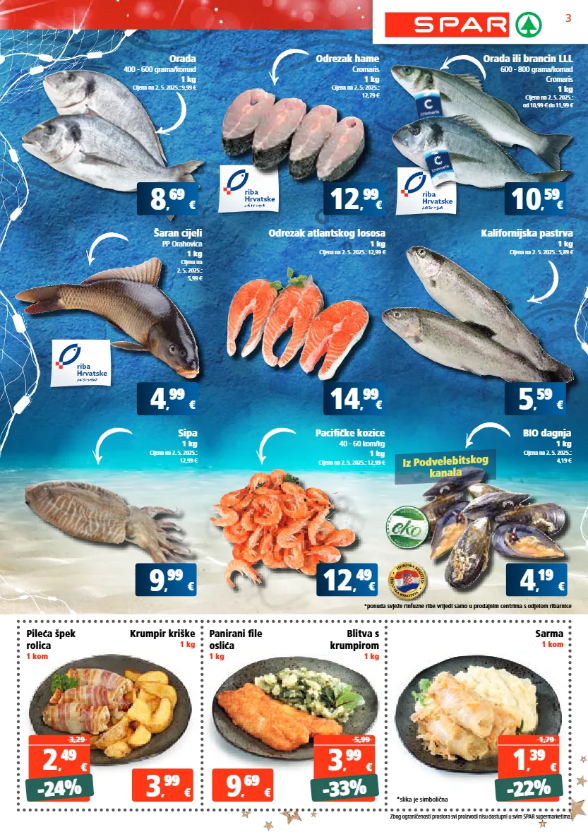 *ponuda svježe rinfuzne ribe vrijedi samo u prodajnim centrima s odjelom ribarnice h r v a t s k a k v a l i t e t a h r v a t s k a k v a l i t e t a iz podvelebitskog kanala pacifičke kozice 40 - 60 kom/kg 1 kg cijena na 2. 5. 2025.: 12,99 € kalifornijska pastrva 1 kg cijena na 2. 5. 2025.: 5,89 € sipa 1 kg cijena na 2. 5. 2025.: 12,99 € odrezak atlantskog lososa 1 kg cijena na 2. 5. 2025.: 12,99 € odrezak hame cromaris 1 kg cijena na 2. 5. 2025.: 12,79 € orada ili brancin lll 600 - 800 grama/komad cromaris 1 kg cijena na 2. 5. 2025.: od 10,99 € do 11,99 € bio dagnja 1 kg cijena na 2. 5. 2025.: 4,19 € šaran cijeli pp orahovica 1 kg cijena na 2. 5. 2025.: 5,99 € orada 400 - 600 grama/komad 1 kg cijena na 2. 5. 2025.: 9,99 € € 8 , 69 69 € 4 , 99 99 € 4 , 19 19 € 12 , 99 99 € 14 , 99 99 € 9 , 99 99 € 10 , 59 59 € 5 , 59 59 € 12 , 49 49 pileća špek rolica 1 kom panirani file oslića 1 kg krumpir kriške 1 kg blitva s krumpirom 1 kg sarma 1 kom -33% -33% 5,99 € 3 , 99 99 -22% -22% 1,79 € 1 , 39 39 -24% -24% 3,29 € 2 , 49 49 € 3 , 99 99 € 9 , 69 69 *slika je simbolična 3 zbog ograničenosti prostora svi proizvodi nisu dostupni u svim spar supermarketima.