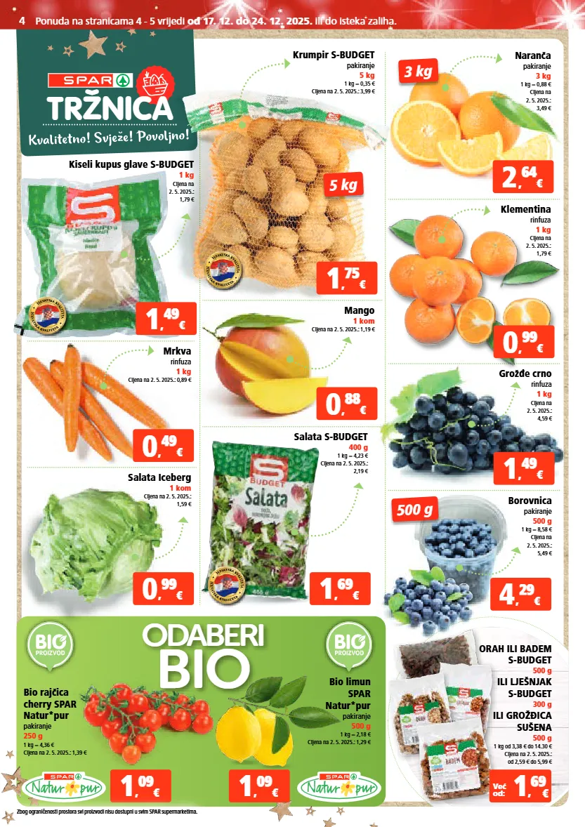 tržnica h r v a t s k a k v a l i t e t a h r v a t s k a k v a l i t e t a odaberi bio krumpir s-budget pakiranje 5 kg 1 kg = 0,35 € cijena na 2. 5. 2025.: 3,99 € kiseli kupus glave s-budget 1 kg cijena na 2. 5. 2025.: 1,79 € salata s-budget 400 g 1 kg = 4,23 € cijena na 2. 5. 2025.: 2,19 € salata iceberg 1 kom cijena na 2. 5. 2025.: 1,59 € mrkva rinfuza 1 kg cijena na 2. 5. 2025.: 0,89 € klementina rinfuza 1 kg cijena na 2. 5. 2025.: 1,79 € naranča pakiranje 3 kg 1 kg = 0,88 € cijena na 2. 5. 2025.: 3,49 € mango 1 kom cijena na 2. 5. 2025.: 1,19 € 1 , 75 75 € 1 , 49 49 € 1 , 69 69 € 0 , 99 99 € 0 , 49 49 € 0 , 99 99 € 1 , 49 49 € 2 , 64 64 € 0 , 88 88 € 1 , 09 09 € bio rajčica cherry spar natur*pur pakiranje 250 g 1 kg = 4,36 € cijena na 2. 5. 2025.: 1,39 € bio limun spar natur*pur pakiranje 500 g 1 kg = 2,18 € cijena na 2. 5. 2025.: 1,29 € 1 , 09 09 € 4 , 29 29 € borovnica pakiranje 500 g 1 kg = 8,58 € cijena na 2. 5. 2025.: 5,49 € orah ili badem s-budget 500 g ili lješnjak s-budget 300 g ili grožđica sušena 500 g 1 kg od 3,38 € do 14.30 € cijena na 2. 5. 2025.: od 2,59 € do 5,99 € grožđe crno rinfuza 1 kg cijena na 2. 5. 2025.: 4,59 € h r v a t s k a k v a l i t e t a h r v a t s k a k v a l i t e t a h r v a t s k a k v a l i t e t a h r v a t s k a k v a l i t e t a već od: € 1 , 69 69 500 g 3 kg 5 kg zbog ograničenosti prostora svi proizvodi nisu dostupni u svim spar supermarketima. 4 ponuda na stranicama 4 - 5 vrijedi od 17. 12. do 24. 12. 2025. ili do isteka zaliha. zbog ograničenosti prostora svi proizvodi nisu dostupni u svim spar supermarketima.