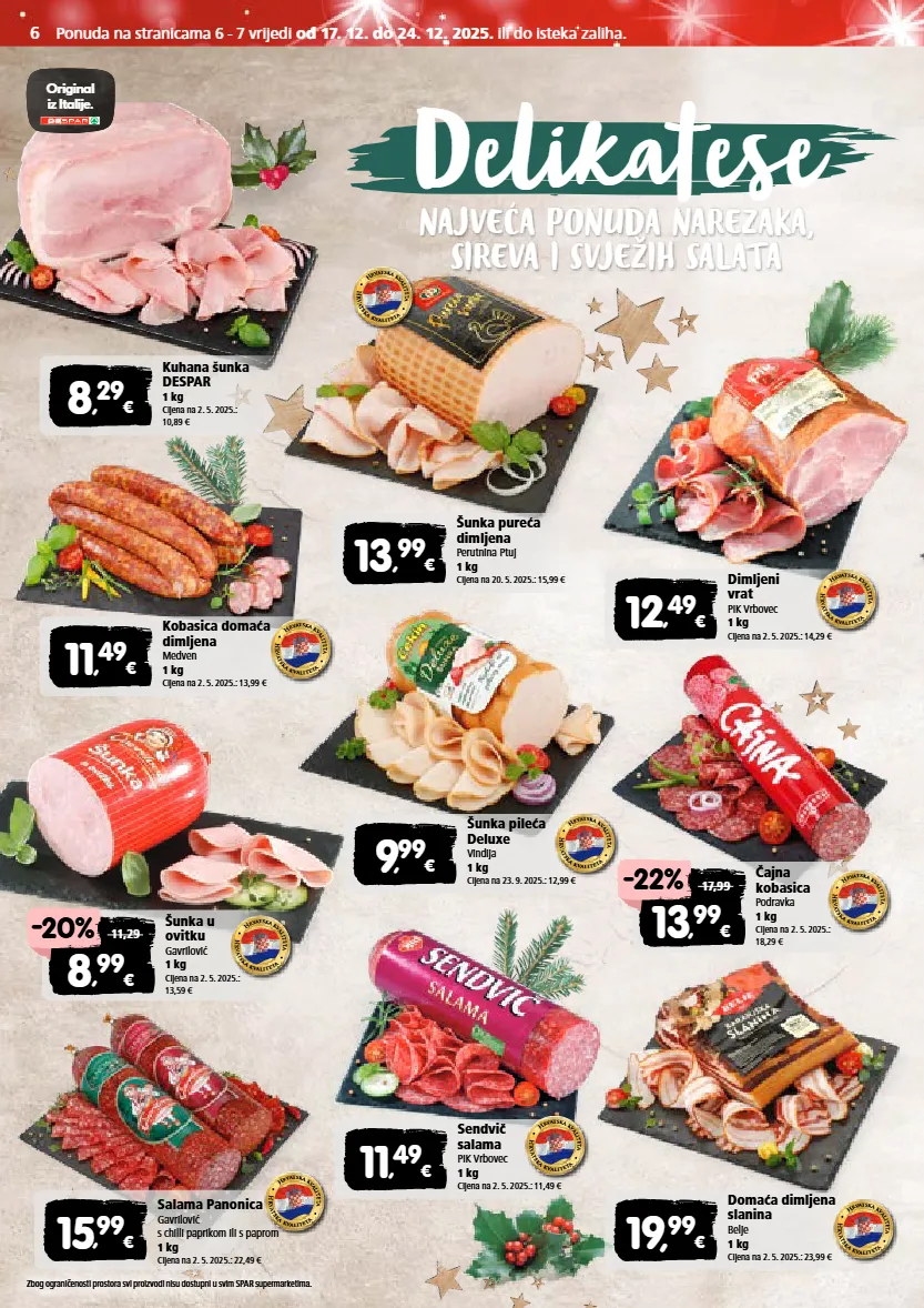 11 , 49 € kobasica domaća dimljena medven 1 kg cijena na 2. 5. 2025.: 13,99 € delikatese najveća ponuda narezaka, sireva i svježih salata 15 , 99 € salama panonica gavrilović s chilli paprikom ili s paprom 1 kg cijena na 2. 5. 2025.: 22,49 € 11 , 49 € sendvič salama pik vrbovec 1 kg cijena na 2. 5. 2025.: 11,49 € 9 , 99 € šunka pileća deluxe vindija 1 kg cijena na 23. 9. 2025.: 12,99 € 12 , 49 € dimljeni vrat pik vrbovec 1 kg cijena na 2. 5. 2025.: 14,29 € 13 , 99 € šunka pureća dimljena perutnina ptuj 1 kg cijena na 20. 5. 2025.: 15,99 € 8 , 29 € kuhana šunka despar 1 kg cijena na 2. 5. 2025.: 10,89 € 19 , 99 € domaća dimljena slanina belje 1 kg cijena na 2. 5. 2025.: 23,99 € šunka u ovitku gavrilović 1 kg cijena na 2. 5. 2025.: 13,59 € 11,29 8 , 99 € -20% h r v a t s k a k v a l i t e t a h r v a t s k a k v a l i t e t a čajna kobasica podravka 1 kg cijena na 2. 5. 2025.: 18,29 € 17,99 13 , 99 € -22% h r v a t s k a k v a l i t e t a h r v a t s k a k v a l i t e t a h r v a t s k a k v a l i t e t a h r v a t s k a k v a l i t e t a h r v a t s k a k v a l i t e t a h r v a t s k a k v a l i t e t a h r v a t s k a k v a l i t e t a h r v a t s k a k v a l i t e t a h r v a t s k a k v a l i t e t a h r v a t s k a k v a l i t e t a h r v a t s k a k v a l i t e t a h r v a t s k a k v a l i t e t a h r v a t s k a k v a l i t e t a h r v a t s k a k v a l i t e t a original iz italije. h r v a t s k a k v a l i t e t a h r v a t s k a k v a l i t e t a zbog ograničenosti prostora svi proizvodi nisu dostupni u svim spar supermarketima. 6 ponuda na stranicama 6 - 7 vrijedi od 17. 12. do 24. 12. 2025. ili do isteka zaliha. zbog ograničenosti prostora svi proizvodi nisu dostupni u svim spar supermarketima.
