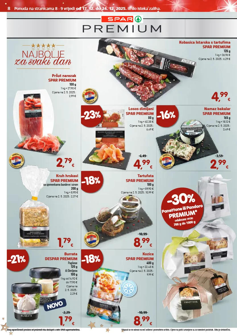4 , 99 € 2 , 79 € 1 , 79 € 4 , 99 € 6,49 8 , 99 € 10,99 8 , 99 € 10,99 1 , 79 € 2,29 2 , 99 € 3,59 -23 % -16 % -21 % -18 % -18 % -30 % panettone ili pandoro premium* odabrane vrste 700 g do 1000 g kobasica istarska s tartufima spar premium 135 g 1 kg = 36,96 € cijena na 2. 5. 2025.: 6,29 € pršut narezak spar premium 100 g 1 kg = 27,90 € cijena na 2. 5. 2025.: 2,99 € kruh hrskavi spar premium sa sjemenkama bundeve i sirom 200 g 1 kg = 8,95 € cijena na 2. 5. 2025.: 2,37 € tartufata spar premium 100 g 1 kg = 89,90 € cijena na 2. 5. 2025.: 10,99 € kozice spar premium 400 g 1 kg = 22,48 € cijena na 2. 5. 2025.: 9,99 € burrata despar premium pugliese 120 g ili dimljena 100 g 1 kg od 14,92 € do 17,90 € cijena na 2. 5. 2025.: 2,29 € losos dimljeni spar premium 80 g 1 kg = 62,38 € cijena na 2. 5. 2025.: 6,49 € namaz bakalar spar premium 165 g 1 kg = 18,12 € cijena na 2. 5. 2025.: 3,49 € h r v a t s k a k v a l i t e t a h r v a t s k a k v a l i t e t a h r v a t s k a k v a l i t e t a h r v a t s k a k v a l i t e t a h r v a t s k a k v a l i t e t a h r v a t s k a k v a l i t e t a h r v a t s k a k v a l i t e t a h r v a t s k a k v a l i t e t a novo zbog ograniženosti prostora s vi proizvodi nisu dostupni u s vim spar s u permarketima. 8 ponuda na stranicama 8 - 9 vrijedi od 17. 12. do 24. 12. 2025. ili do isteka zaliha. zbog ograničenosti prostora svi proizvodi nisu dostupni u svim spar supermarketima. najbolje za svaki dan *popust se ne odnosi na već snižene i promotivne artikle. cijene na polici umanjene su za navedeni postotak. slika je simbolična.