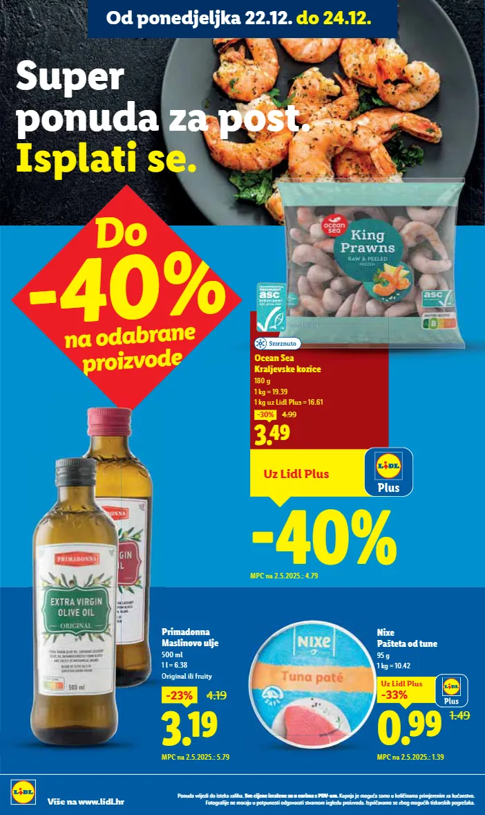 super ponuda za post. .óìòúǿó¨ı primadonna maslinovo ulje 500 ml 1 l = 6.38 original ili fruity biæî -23% 4.19 mpc na 2.5.2025.: 5.79 do -40% na odabrane proizvode orig 2 p m 5 1 o uz lidl plus h_@ mpc na 2.5.2025.: 4.79 biéî -30% 4.99 ocean sea kraljevske kozice 180 g 1 kg = 19.39 1 kg uz lidl plus = 16.61 o cean sea j i 1.49 _iîî -33% uz lidl plus mpc na 2.5.2025.: 1.39 nixe pašteta od tune 95 g 1 kg = 10.42 ǭàȕȡǽdzċȝǿȋ¨ǽǿǽàǿóú¨ïdzėdzȏǿ½dzı ]ċ¨ǿȋ¨ȕ¨ǿėȝdzę¨ȕ¨óȡȡ¨ȡȝǿȕdzóǭǟtɩàȕı ;ȡȝȕȋdzȋ¨ȕà¸ȡdzódzȕàȡïàȏǿ ǿȕdzȕdzȝȝǿȕȋ¨ȝ¨ȕǿȕėdzïȡdzȕóúċàı %àúà¸ȝdz³ǿȋ¨ȕ¨ȕàȝdzȋȡȡȝàúȝȡȕàóúǿàǽ¸àċdzȝdzúǿóúċdzȝȕàȕǿė¸ȏ¨ǽȡȝȝàǿėċàǽdzıǣóȝȝǿ dzċdzȕàó¨ėà¸ȕà¸ȡǿ½úǿóïdzȝóïǿ½ȝà¸ȝ¨õdzïdzı više na www.lidl.hr od ponedjeljka 22.12. do 24.12.