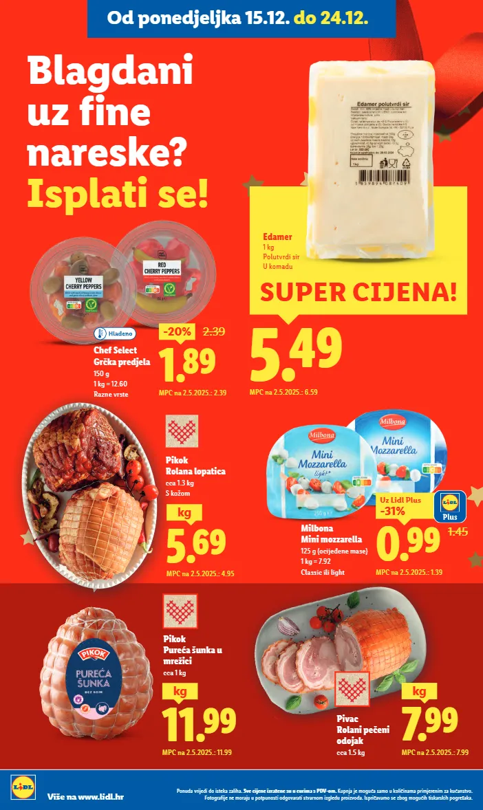 pikok rolana lopatica cca 1.3 kg s kožom 5.69 kg mpc na 2.5.2025.: 4.95 pivac rolani pečeni odojak cca 1.5 kg 7.99 kg mpc na 2.5.2025.: 7.99 1.89 -20% 2.39 mpc na 2.5.2025.: 2.39 chef select grčka predjela 150 g 1 kg = 12.60 razne vrste 11.99 kg mpc na 2.5.2025.: 11.99 pikok pureća šunka u mrežici cca 1 kg 5.49 mpc na 2.5.2025.: 6.59 super cijena! edamer 1 kg polutvrdi sir u komadu milbona mini mozzarella 125 g (ocijeđene mase) 1 kg = 7.92 classic ili light 1.45 0.99 -31% uz lidl plus mpc na 2.5.2025.: 1.39 blagdani uz fine nareske? isplati se! ponuda vrijedi do isteka zaliha. sve cijene izražene su u eurima s pdv-om. kupnja je moguća samo u količinama primjerenim za kućanstvo. fotografije ne moraju u potpunosti odgovarati stvarnom izgledu proizvoda. ispričavamo se zbog mogućih tiskarskih pogrešaka. više na www.lidl.hr od ponedjeljka 15.12. do 24.12.