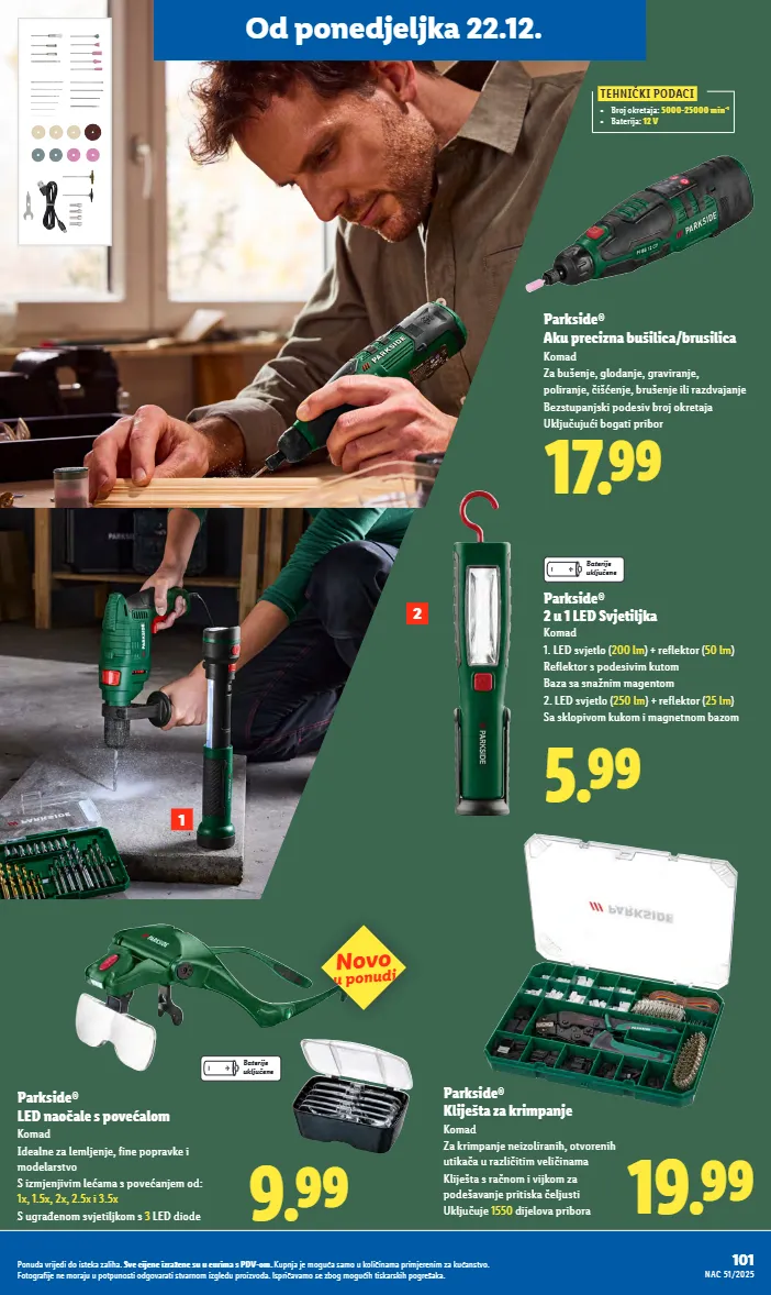 od ponedjeljka 22.12. 17.99 parkside ® aku precizna bušilica/brusilica komad za bušenje, glodanje, graviranje, poliranje, čišćenje, brušenje ili razdvajanje bezstupanjski podesiv broj okretaja uključujući bogati pribor 2 1 tehnički podaci • broj okretaja: 5000-25000 min -1 • baterija: 12 v 5.99 parkside ® 2 u 1 led svjetiljka komad 1. led svjetlo ( 200 lm ) + reflektor ( 50 lm ) reflektor s podesivim kutom baza sa snažnim magentom 2. led svjetlo ( 250 lm ) + reflektor ( 25 lm ) sa sklopivom kukom i magnetnom bazom baterije uključene 9.99 parkside ® led naočale s povećalom komad idealne za lemljenje, fine popravke i modelarstvo s izmjenjivim lećama s povećanjem od: 1x, 1.5x, 2x, 2.5x i 3.5x s ugrađenom svjetiljkom s 3 led diode 19.99 parkside ® kliješta za krimpanje komad za krimpanje neizoliranih, otvorenih utikača u različitim veličinama kliješta s račnom i vijkom za podešavanje pritiska čeljusti uključuje 1550 dijelova pribora novo u ponudi baterije uključene 101 nac 51/2025 ponuda vrijedi do isteka zaliha. sve cijene izražene su u eurima s pdv-om. kupnja je moguća samo u količinama primjerenim za kućanstvo. fotografije ne moraju u potpunosti odgovarati stvarnom izgledu proizvoda. ispričavamo se zbog mogućih tiskarskih pogrešaka.