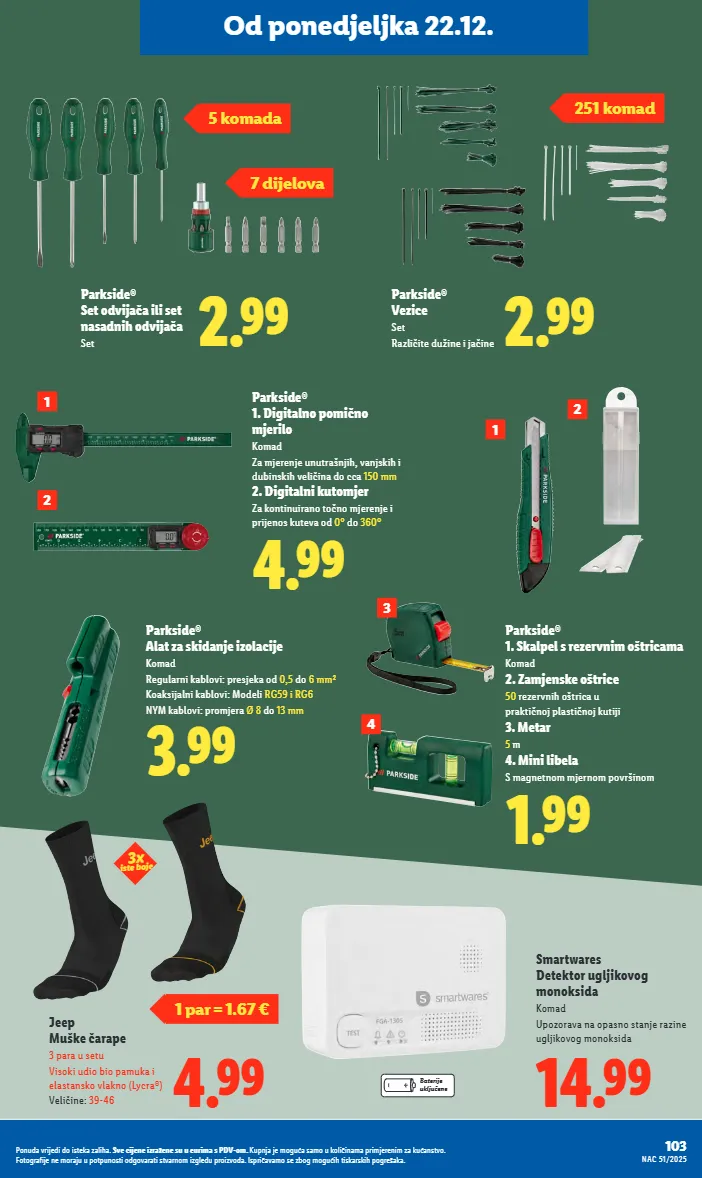 od ponedjeljka 22.12. 4.99 jeep muške čarape 3 para u setu visoki udio bio pamuka i elastansko vlakno (lycra®) veličine: 39-46 1 par = 1.67 € 3x iste boje 14.99 smartwares detektor ugljikovog monoksida komad upozorava na opasno stanje razine ugljikovog monoksida baterije uključene 2.99 parkside ® vezice set različite dužine i jačine 251 komad 1.99 parkside ® 1. skalpel s rezervnim oštricama komad 2. zamjenske oštrice 50 rezervnih oštrica u praktičnoj plastičnoj kutiji 3. metar 5 m 4. mini libela s magnetnom mjernom površinom 1 2 3 4 2.99 parkside ® set odvijača ili set nasadnih odvijača set 7 dijelova 5 komada 4.99 parkside ® 1. digitalno pomično mjerilo komad za mjerenje unutrašnjih, vanjskih i dubinskih veličina do cca 150 mm 2. digitalni kutomjer za kontinuirano točno mjerenje i prijenos kuteva od 0° do 360° 3.99 parkside ® alat za skidanje izolacije komad regularni kablovi: presjeka od 0,5 do 6 mm² koaksijalni kablovi: modeli rg59 i rg6 nym kablovi: promjera ø 8 do 13 mm 2 1 103 nac 51/2025 ponuda vrijedi do isteka zaliha. sve cijene izražene su u eurima s pdv-om. kupnja je moguća samo u količinama primjerenim za kućanstvo. fotografije ne moraju u potpunosti odgovarati stvarnom izgledu proizvoda. ispričavamo se zbog mogućih tiskarskih pogrešaka.