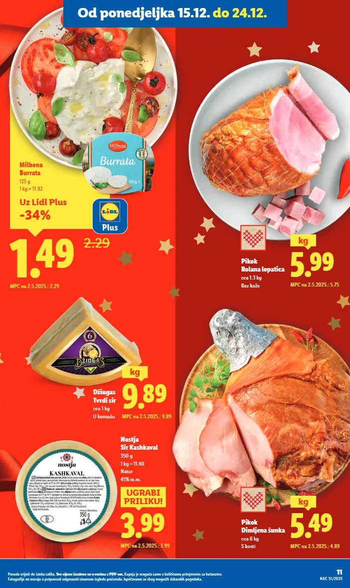 1.59 mpc na 6.11.2025.: 1.59 combino šarena tjestenina s božićnim motivima 500 g 1 kg = 3.18 losos u lisnatom tijestu 700 g 1 kg = 15.70 sa špinatom, šampinjonima, porilukom ili s koprom 10.99 mpc na 6.11.2025.: 10.99 freshona blagdanski mix povrća 750 g 1 kg = 3.05 brokula, mrkva, cvjetača i paprika ili brokula, cvjetača i romanesco 2.29 mpc na 6.11.2025.: 2.29 toma sir s tartufima 150 g 1 kg = 21.93 3.29 mpc na 15.12.2025.: 3.29 uz lidl plus -21% 2.99 3.79 maslac s morskom soli 250 g 1 kg = 11.96 vrijedi do srijede 24.12. mpc na 9.5.2025.: 3.49 1.99 2.59 mpc na 10.11.2025.: 2.59 -23% uz lidl plus roquefort sir 100 g 1 kg = 25.90 1 kg uz lidl plus = 19.90 od ovčjeg mlijeka vrijedi do srijede 24.12. 3.49 mpc na 6.11.2025.: 3.49 umak od škampa 300 g 1 kg = 11.63 25 nac 51/2025 ponuda vrijedi do isteka zaliha. sve cijene izražene su u eurima s pdv-om. kupnja je moguća samo u količinama primjerenim za kućanstvo. fotografije ne moraju u potpunosti odgovarati stvarnom izgledu proizvoda. ispričavamo se zbog mogućih tiskarskih pogrešaka. od ponedjeljka 15.12.