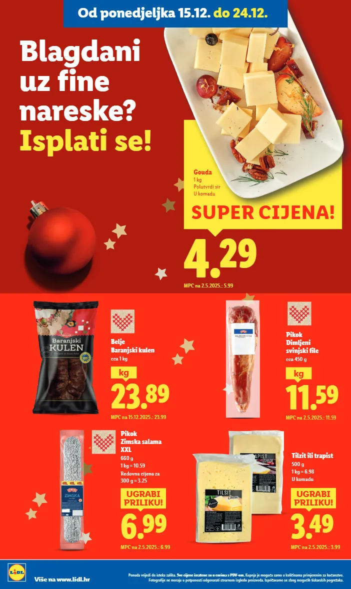 23.89 kg mpc na 15.12.2025.: 23.99 belje baranjski kulen cca 1 kg 6.99 ugrabi priliku! mpc na 2.5.2025.: 6.99 pikok zimska salama xxl 660 g 1 kg = 10.59 redovna cijena za 300 g = 3.25 4.29 mpc na 2.5.2025.: 5.99 super cijena! gouda 1 kg polutvrdi sir u komadu 3.49 ugrabi priliku! mpc na 2.5.2025.: 3.99 tilzit ili trapist 500 g 1 kg = 6.98 u komadu 11.59 kg mpc na 2.5.2025.: 11.59 pikok dimljeni svinjski file cca 450 g blagdani uz fine nareske? isplati se! ponuda vrijedi do isteka zaliha. sve cijene izražene su u eurima s pdv-om. kupnja je moguća samo u količinama primjerenim za kućanstvo. fotografije ne moraju u potpunosti odgovarati stvarnom izgledu proizvoda. ispričavamo se zbog mogućih tiskarskih pogrešaka. više na www.lidl.hr ponuda vrijedi do isteka zaliha. sve cijene izražene su u eurima s pdv-om. kupnja je moguća samo u količinama primjerenim za kućanstvo. fotografije ne moraju u potpunosti odgovarati stvarnom izgledu proizvoda. ispričavamo se zbog mogućih tiskarskih pogrešaka. više na www.lidl.hr od ponedjeljka 15.12. do 24.12.