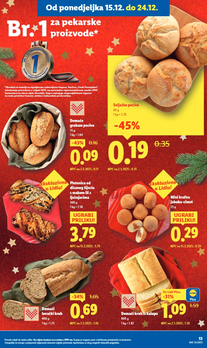 *rezultat se temelji na izjavljenom zadovoljstvu kupaca. yougov „fresh perception”. istraživanje provedeno u veljači 2025. na nacionalno reprezentativnom uzorku 1200 kućanstava na nivou cijele hrvatske. kupci ocjenjuju nespecijalizirane trgovce na malo pretežno hranom. pićima i duhanskim proizvodima. za pekarske proizvode* br. 1 3.79 ugrabi priliku! mpc na 15.2.2025.: 3.79 pletenica od dizanog tijesta s makom ili s lješnjacima 500 g 1 kg = 7.58 0.69 -34% 1.05 mpc na 2.5.2025.: 1.05 domaći lovački kruh 400 g 1 kg = 1.73 domaće graham pecivo 55 g 1 kg = 1.64 0.09 -43% 0.16 mpc na 2.5.2025.: 0.17 1.59 1.09 -31% uz lidl plus mpc na 2.5.2025.: 1.59 domaći kruh iz kalupa 600 g 1 kg = 1.82 0.19 0.35 seljačko pecivo 80 g 1 kg = 2.38 mpc na 2.5.2025.: 0.35 -45% ekskluzivno u lidlu! ekskluzivno u lidlu! 0.29 ugrabi priliku! mpc na 15.2.2025.: 0.29 mini krafna jabuka-cimet 25 g 13 nac 51/2025 ponuda vrijedi do isteka zaliha. sve cijene izražene su u eurima s pdv-om. kupnja je moguća samo u količinama primjerenim za kućanstvo. fotografije ne moraju u potpunosti odgovarati stvarnom izgledu proizvoda. ispričavamo se zbog mogućih tiskarskih pogrešaka. od ponedjeljka 15.12. do 24.12.