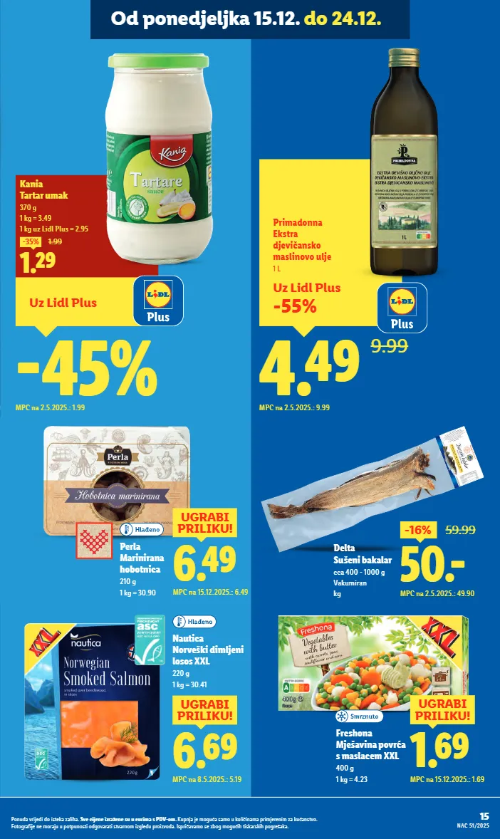 delta sušeni bakalar cca 400 - 1000 g vakumiran kg 50. - -16% 59.99 mpc na 2.5.2025.: 49.90 6.49 ugrabi priliku! mpc na 15.12.2025.: 6.49 perla marinirana hobotnica 210 g 1 kg = 30.90 1.69 ugrabi priliku! mpc na 15.12.2025.: 1.69 freshona mješavina povrća s maslacem xxl 400 g 1 kg = 4.23 6.69 ugrabi priliku! mpc na 8.5.2025.: 5.19 nautica norveški dimljeni losos xxl 220 g 1 kg = 30.41 uz lidl plus -55% 4.49 9.99 primadonna ekstra djevičansko maslinovo ulje 1 l mpc na 2.5.2025.: 9.99 uz lidl plus -45% mpc na 2.5.2025.: 1.99 1.29 -35% 1.99 kania tartar umak 370 g 1 kg = 3.49 1 kg uz lidl plus = 2.95 15 nac 51/2025 ponuda vrijedi do isteka zaliha. sve cijene izražene su u eurima s pdv-om. kupnja je moguća samo u količinama primjerenim za kućanstvo. fotografije ne moraju u potpunosti odgovarati stvarnom izgledu proizvoda. ispričavamo se zbog mogućih tiskarskih pogrešaka. od ponedjeljka 15.12. do 24.12.
