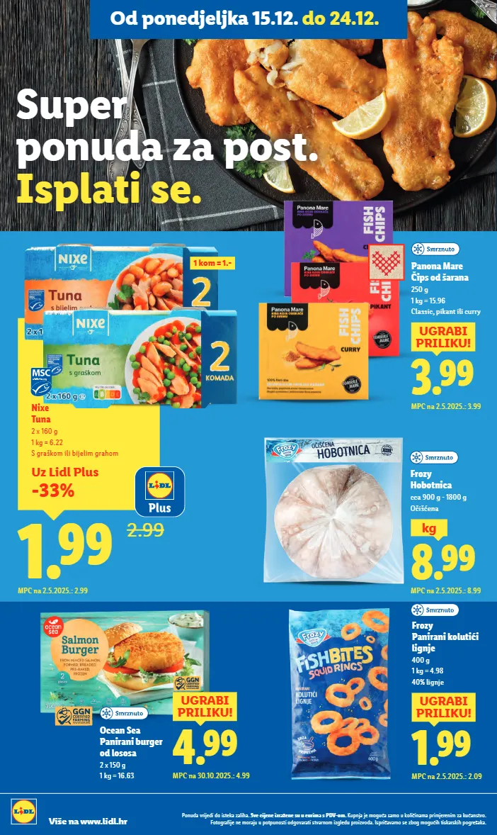 3.99 ugrabi priliku! mpc na 2.5.2025.: 3.99 panona mare čips od šarana 250 g 1 kg = 15.96 classic, pikant ili curry 8.99 kg mpc na 2.5.2025.: 8.99 frozy hobotnica cca 900 g - 1800 g očišćena 4.99 ugrabi priliku! mpc na 30.10.2025.: 4.99 ocean sea panirani burger od lososa 2 x 150 g 1 kg = 16.63 1.99 ugrabi priliku! mpc na 2.5.2025.: 2.09 frozy panirani kolutići lignje 400 g 1 kg = 4.98 40% lignje uz lidl plus -33% 1.99 2.99 nixe tuna 2 x 160 g 1 kg = 6.22 s graškom ili bijelim grahom mpc na 2.5.2025.: 2.99 1 kom = 1.- super ponuda za post. isplati se. ponuda vrijedi do isteka zaliha. sve cijene izražene su u eurima s pdv-om. kupnja je moguća samo u količinama primjerenim za kućanstvo. fotografije ne moraju u potpunosti odgovarati stvarnom izgledu proizvoda. ispričavamo se zbog mogućih tiskarskih pogrešaka. više na www.lidl.hr od ponedjeljka 15.12. do 24.12.