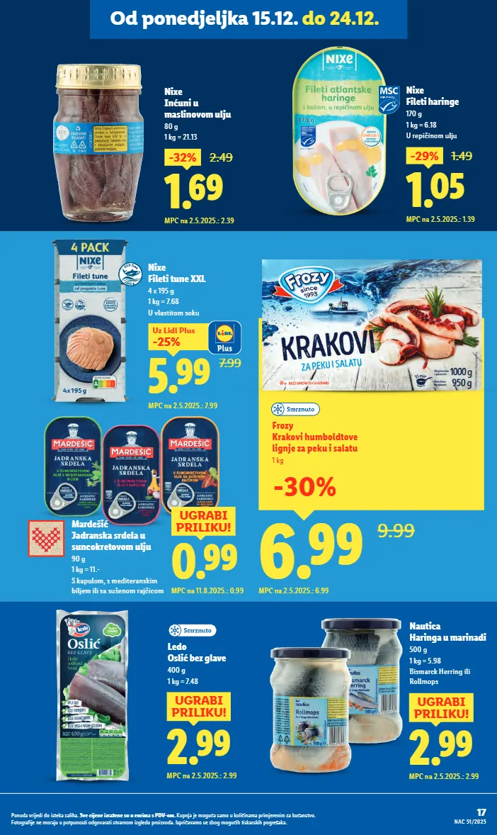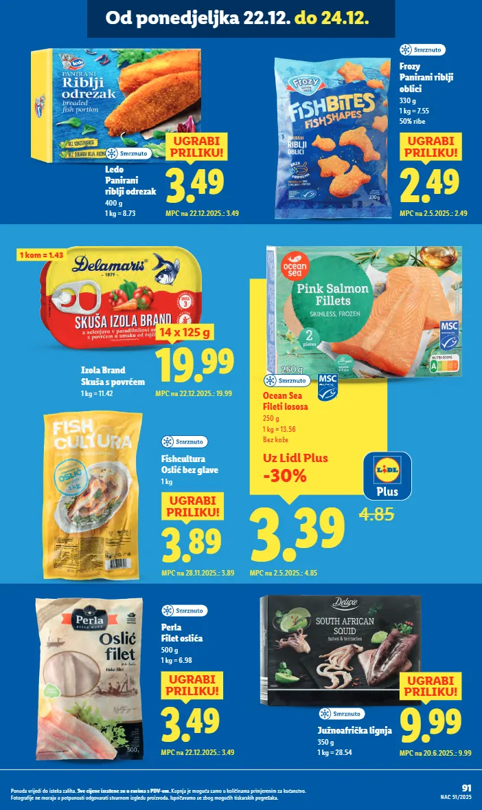 6.99 ugrabi priliku! mpc na 2.5.2025.: 6.99 ledo crni bakalar filet 400 g 1 kg = 17.48 3.29 ugrabi priliku! mpc na 2.5.2025.: 3.29 panona mare nuggets od šarana 240 g 1 kg = 13.71 classic ili kids 2.29 -32% 3.39 mpc na 2.5.2025.: 3.39 okusi zavičaja bakalar na bijelo 165 g 1 kg = 13.88 okusi zavičaja svježi riblji namaz 165 g 1 kg = 17.52 s jadranskim kozicama ili bakalar na bijelo 2.89 -27% 3.99 mpc na 2.5.2025.: 3.99 6.49 4.59 -29% uz lidl plus mpc na 2.5.2025.: 6.49 ocean sea patagonijska lignja 360 g (ocijeđene mase) 1 kg = 12.75 tube i krakovi 5.49 ugrabi priliku! mpc na 18.12.2025.: 5.49 perla marinirane kozice 210 g 1 kg = 26.14 6.89 ugrabi priliku! mpc na 18.12.2025.: 6.89 perla sipa 235 g 1 kg = 29.32 kockice 3.39 mpc na 2.5.2025.: 4.99 super cijena! ocean sea oslić bez glave 1 kg 73 nac 51/2025 ponuda vrijedi do isteka zaliha. sve cijene izražene su u eurima s pdv-om. kupnja je moguća samo u količinama primjerenim za kućanstvo. fotografije ne moraju u potpunosti odgovarati stvarnom izgledu proizvoda. ispričavamo se zbog mogućih tiskarskih pogrešaka. od četvrtka 18.12. do 24.12.