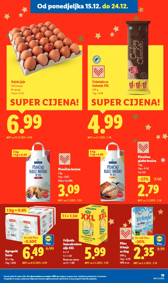 pilos vrhnje za šlag 500 g 1 kg = 4.70 36% m.m. 5 kg 1 kg = 0.62 3.09 mpc na 2.5.2025.: 2.85 pšenično brašno 5 kg 1 kg = 0.62 oštro tip 400 5.99 mpc na 2.5.2025.: 5.99 zvijezda suncokretovo ulje xxl 4 x 1 l 1 l = 1.50 redovna cijena za 1 l = 1.69 5 kg 1 kg = 0.56 4.99 mpc na 2.5.2025.: 5.59 super cijena! čokolada za kuhanje xxl 500 g 1 kg = 9.98 3.39 2.35 -30% uz lidl plus mpc na 2.5.2025.: 3.39 6.99 mpc na 15.12.2025.: 6.99 super cijena! svježa jaja 30 komada m razred 1 kom = 0.23 agragold šećer 10 x 1 kg 1 kg = 0.65 1 kg = 0.65 1 l = 1.50 6.99 6.49 -0.50€ uz lidl plus mpc na 8.12.2025.: 6.99 2.79 -22% 3.58 mpc na 2.5.2025.: 3.58 pšenično glatko brašno 5 kg 1 kg = 0.56 tip 550 19 nac 51/2025 ponuda vrijedi do isteka zaliha. sve cijene izražene su u eurima s pdv-om. kupnja je moguća samo u količinama primjerenim za kućanstvo. fotografije ne moraju u potpunosti odgovarati stvarnom izgledu proizvoda. ispričavamo se zbog mogućih tiskarskih pogrešaka. od ponedjeljka 15.12. do 24.12.