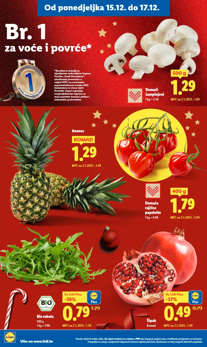 ponuda vrijedi do isteka zaliha. sve cijene izražene su u eurima s pdv-om. kupnja je moguća samo u količinama primjerenim za kućanstvo. fotografije ne moraju u potpunosti odgovarati stvarnom izgledu proizvoda. ispričavamo se zbog mogućih tiskarskih pogrešaka. više na www.lidl.hr od ponedjeljka 15.12. do 17.12. br. 1 za voće i povrće* *rezultat se temelji na izjavljenom zadovoljstvu kupaca. yougov „fresh perception”, istraživanje provedeno u veljači 2025. na nacionalno reprezentativnom uzorku 1200 kućanstava na nivou cijele hrvatske. kupci ocjenjuju nespecijalizirane trgovce na malo pretežno hranom, pićima i duhanskim proizvodima. domaći šampinjoni 1 kg = 2.58 1.29 500 g mpc na 2.5.2025.: 1.89 mpc na 2.5.2025.: 1.29 1.29 0.79 -38% uz lidl plus bio rukola 100 g 1 kg = 7.90 mpc na 2.5.2025.: 1.49 0.79 0.49 -37% uz lidl plus šipak komad ananas 1.29 komad mpc na 2.5.2025.: 2.49 domaća rajčica papeletto 1 kg = 4.48 1.79 400 g mpc na 2.5.2025.: 2.69