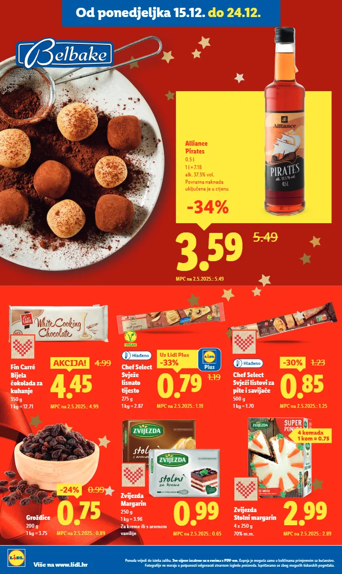 Chef Select Svježe lisnato tijesto 275 g 1 kg = 2.87 1.19 0.79 -33% Uz Lidl Plus MPC na 2.5.2025.: 1.19 0.85 -30% 1.23 MPC na 2.5.2025.: 1.25 Chef Select Svježi listovi za pite i savijače 500 g 1 kg = 1.70 0.75 -24% 0.99 MPC na 2.5.2025.: 0.89 Grožđice 200 g 1 kg = 3.75 0.99 MPC na 2.5.2025.: 0.65 Zvijezda Margarin 250 g 1 kg = 3.96 Za kreme ili s aromom vanilije 4 komada 1 kom = 0.75 Fin Carré Bijela čokolada za kuhanje 350 g 1 kg = 12.71 4.45 AKCIJA! 4.99 MPC na 2.5.2025.: 4.99 2.99 MPC na 2.5.2025.: 2.89 Zvijezda Stolni margarin 4 x 250 g 70% m.m. 3.59 5.49 Alliance Pirates 0.5 l 1 l = 7.18 alk. 37.5% vol. Povratna naknada uključena je u cijenu MPC na 2.5.2025.: 5.49 -34% Od ponedjeljka 15.12. do 24.12. Ponuda vrijedi do isteka zaliha. Sve cijene izražene su u eurima s PDV-om. Kupnja je moguća samo u količinama primjerenim za kućanstvo. Fotografije ne moraju u potpunosti odgovarati stvarnom izgledu proizvoda. Ispričavamo se zbog mogućih tiskarskih pogrešaka. Više na www.lidl.hr