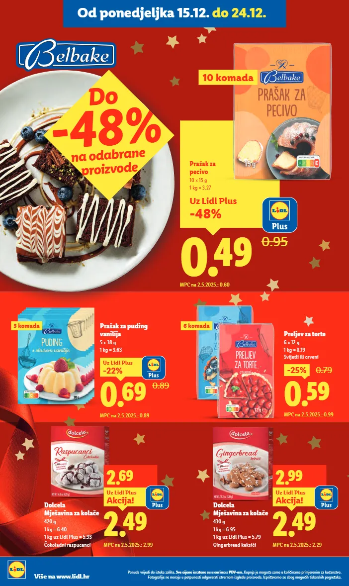 prašak za puding vanilija 5 x 38 g 1 kg = 3.63 0.89 0.69 -22% uz lidl plus mpc na 2.5.2025.: 0.89 0.59 -25% 0.79 mpc na 2.5.2025.: 0.99 preljev za torte 6 x 12 g 1 kg = 8.19 svijetli ili crveni do -48% na odabrane proizvode uz lidl plus -48% 0.49 0.95 prašak za pecivo 10 x 15 g 1 kg = 3.27 mpc na 2.5.2025.: 0.60 10 komada 5 komada 6 komada od ponedjeljka 15.12. do 24.12. 2.49 2.69 mpc na 2.5.2025.: 2.99 akcija! uz lidl plus dolcela mješavina za kolače 420 g 1 kg = 6.40 1 kg uz lidl plus = 5.93 čokoladni raspucanci 2.49 2.99 mpc na 2.5.2025.: 2.29 akcija! uz lidl plus dolcela mješavina za kolače 430 g 1 kg = 6.95 1 kg uz lidl plus = 5.79 gingerbread keksići ponuda vrijedi do isteka zaliha. sve cijene izražene su u eurima s pdv-om. kupnja je moguća samo u količinama primjerenim za kućanstvo. fotografije ne moraju u potpunosti odgovarati stvarnom izgledu proizvoda. ispričavamo se zbog mogućih tiskarskih pogrešaka. više na www.lidl.hr