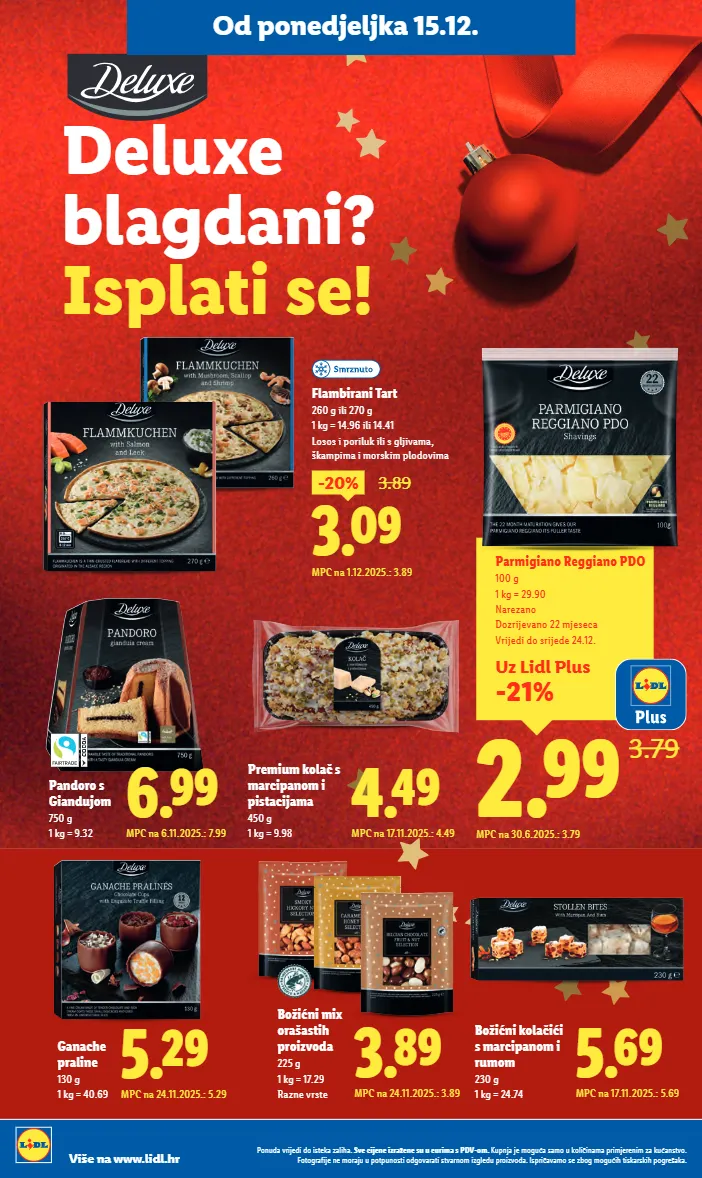 deluxe blagdani? isplati se! 5.29 mpc na 24.11.2025.: 5.29 ganache praline 130 g 1 kg = 40.69 3.89 mpc na 24.11.2025.: 3.89 božićni mix orašastih proizvoda 225 g 1 kg = 17.29 razne vrste 5.69 mpc na 17.11.2025.: 5.69 božićni kolačići s marcipanom i rumom 230 g 1 kg = 24.74 4.49 mpc na 17.11.2025.: 4.49 premium kolač s marcipanom i pistacijama 450 g 1 kg = 9.98 pandoro s giandujom 750 g 1 kg = 9.32 6.99 mpc na 6.11.2025.: 7.99 uz lidl plus -21% 2.99 3.79 parmigiano reggiano pdo 100 g 1 kg = 29.90 narezano dozrijevano 22 mjeseca vrijedi do srijede 24.12. mpc na 30.6.2025.: 3.79 flambirani tart 260 g ili 270 g 1 kg = 14.96 ili 14.41 losos i poriluk ili s gljivama, škampima i morskim plodovima 3.09 -20% 3.89 mpc na 1.12.2025.: 3.89 ponuda vrijedi do isteka zaliha. sve cijene izražene su u eurima s pdv-om. kupnja je moguća samo u količinama primjerenim za kućanstvo. fotografije ne moraju u potpunosti odgovarati stvarnom izgledu proizvoda. ispričavamo se zbog mogućih tiskarskih pogrešaka. više na www.lidl.hr od ponedjeljka 15.12.