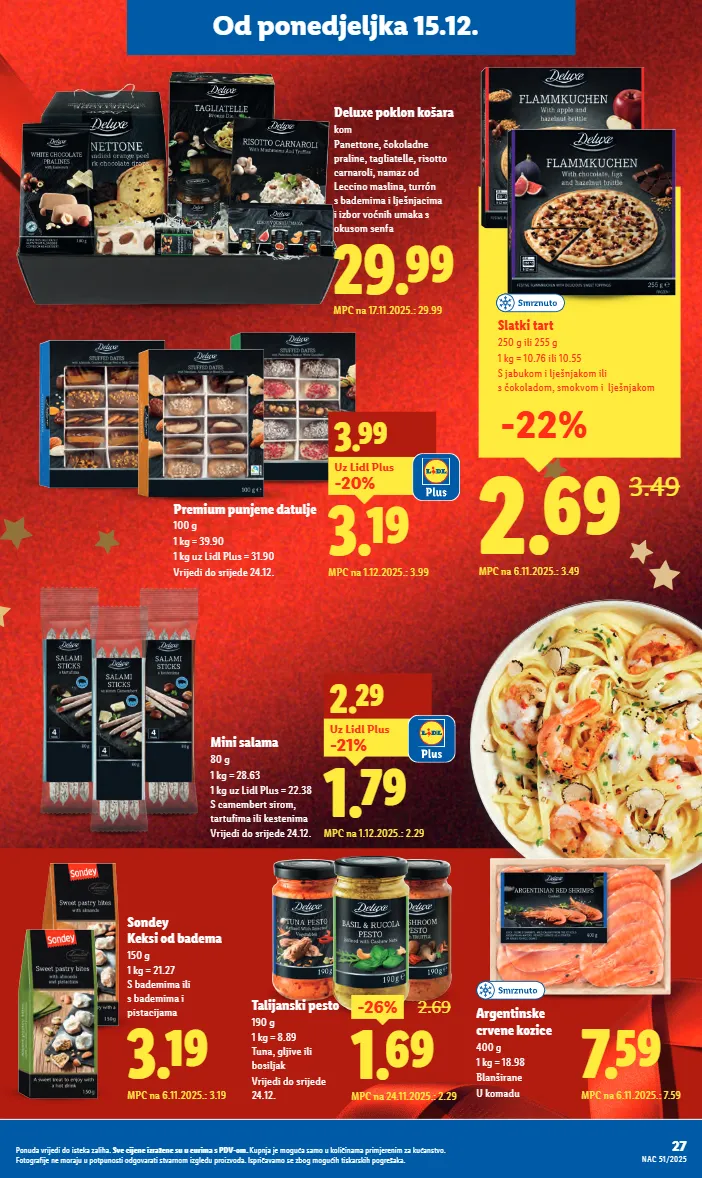 3.19 mpc na 6.11.2025.: 3.19 sondey keksi od badema 150 g 1 kg = 21.27 s bademima ili s bademima i pistacijama 29.99 mpc na 17.11.2025.: 29.99 deluxe poklon košara kom panettone, čokoladne praline, tagliatelle, risotto carnaroli, namaz od leccino maslina, turrón s bademima i lješnjacima i izbor voćnih umaka s okusom senfa 7.59 mpc na 6.11.2025.: 7.59 argentinske crvene kozice 400 g 1 kg = 18.98 blanširane u komadu 3.19 3.99 mpc na 1.12.2025.: 3.99 -20% uz lidl plus 1.79 2.29 mpc na 1.12.2025.: 2.29 -21% uz lidl plus premium punjene datulje 100 g 1 kg = 39.90 1 kg uz lidl plus = 31.90 vrijedi do srijede 24.12. mini salama 80 g 1 kg = 28.63 1 kg uz lidl plus = 22.38 s camembert sirom, tartufima ili kestenima vrijedi do srijede 24.12. talijanski pesto 190 g 1 kg = 8.89 tuna, gljive ili bosiljak vrijedi do srijede 24.12. 1.69 -26% 2.69 mpc na 24.11.2025.: 2.29 2.69 3.49 slatki tart 250 g ili 255 g 1 kg = 10.76 ili 10.55 s jabukom i lješnjakom ili s čokoladom, smokvom i lješnjakom mpc na 6.11.2025.: 3.49 -22% 27 nac 51/2025 ponuda vrijedi do isteka zaliha. sve cijene izražene su u eurima s pdv-om. kupnja je moguća samo u količinama primjerenim za kućanstvo. fotografije ne moraju u potpunosti odgovarati stvarnom izgledu proizvoda. ispričavamo se zbog mogućih tiskarskih pogrešaka. od ponedjeljka 15.12.