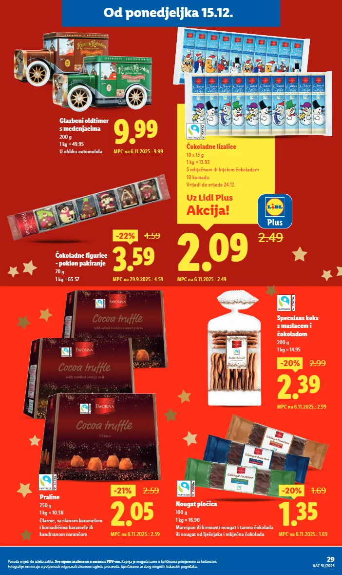 čokoladne figurice - poklon pakiranje 70 g 1 kg = 65.57 nougat pločica 100 g 1 kg = 16.90 marcipan ili kremasti nougat i tamna čokolada ili nougat od lješnjaka i mliječna čokolada 9.99 mpc na 6.11.2025.: 9.99 glazbeni oldtimer s medenjacima 200 g 1 kg = 49.95 u obliku automobila praline 250 g 1 kg = 10.36 classic, sa slanom karamelom i komadićima karamele ili kandiranom narančom uz lidl plus akcija! 2.09 2.49 čokoladne lizalice 10 x 15 g 1 kg = 13.93 s mliječnom ili bijelom čokoladom 10 komada vrijedi do srijede 24.12. mpc na 6.11.2025.: 2.49 3.59 -22% 4.59 mpc na 29.9.2025.: 4.59 2.39 -20% 2.99 mpc na 6.11.2025.: 2.99 speculaas keks s maslacem i čokoladom 200 g 1 kg = 14.95 1.35 -20% 1.69 mpc na 6.11.2025.: 1.69 2.05 -21% 2.59 mpc na 6.11.2025.: 2.59 29 nac 51/2025 ponuda vrijedi do isteka zaliha. sve cijene izražene su u eurima s pdv-om. kupnja je moguća samo u količinama primjerenim za kućanstvo. fotografije ne moraju u potpunosti odgovarati stvarnom izgledu proizvoda. ispričavamo se zbog mogućih tiskarskih pogrešaka. od ponedjeljka 15.12.