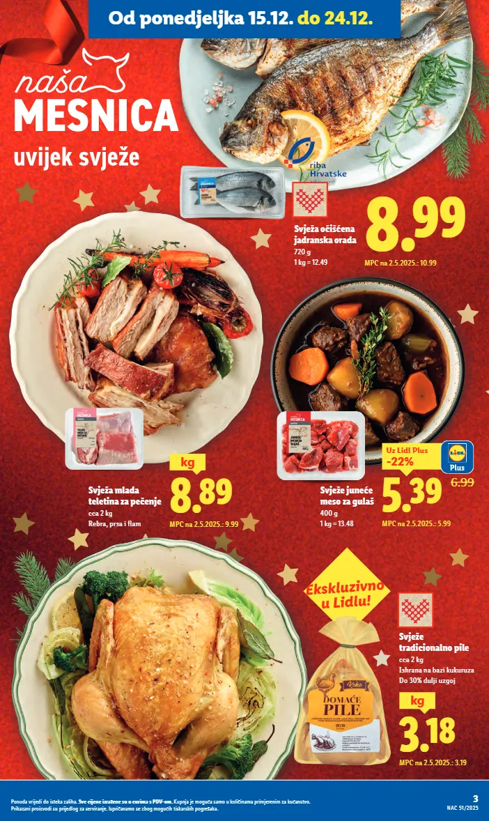 3.18 kg mpc na 2.5.2025.: 3.19 svježe tradicionalno pile cca 2 kg ishrana na bazi kukuruza do 30% dulji uzgoj ekskluzivno u lidlu! svježa mlada teletina za pečenje cca 2 kg rebra, prsa i flam svježe juneće meso za gulaš 400 g 1 kg = 13.48 6.99 5.39 -22% uz lidl plus mpc na 2.5.2025.: 5.99 svježa očišćena jadranska orada 720 g 1 kg = 12.49 8.89 kg mpc na 2.5.2025.: 9.99 8.99 mpc na 2.5.2025.: 10.99 3 nac 51/2025 ponuda vrijedi do isteka zaliha. sve cijene izražene su u eurima s pdv-om. kupnja je moguća samo u količinama primjerenim za kućanstvo. fotografije ne moraju u potpunosti odgovarati stvarnom izgledu proizvoda. ispričavamo se zbog mogućih tiskarskih pogrešaka. od ponedjeljka 15.12. do 24.12. 3 nac 51/2025 ponuda vrijedi do isteka zaliha. sve cijene izražene su u eurima s pdv-om. kupnja je moguća samo u količinama primjerenim za kućanstvo. prikazani proizvodi su prijedlog za serviranje. ispričavamo se zbog mogućih tiskarskih pogrešaka.