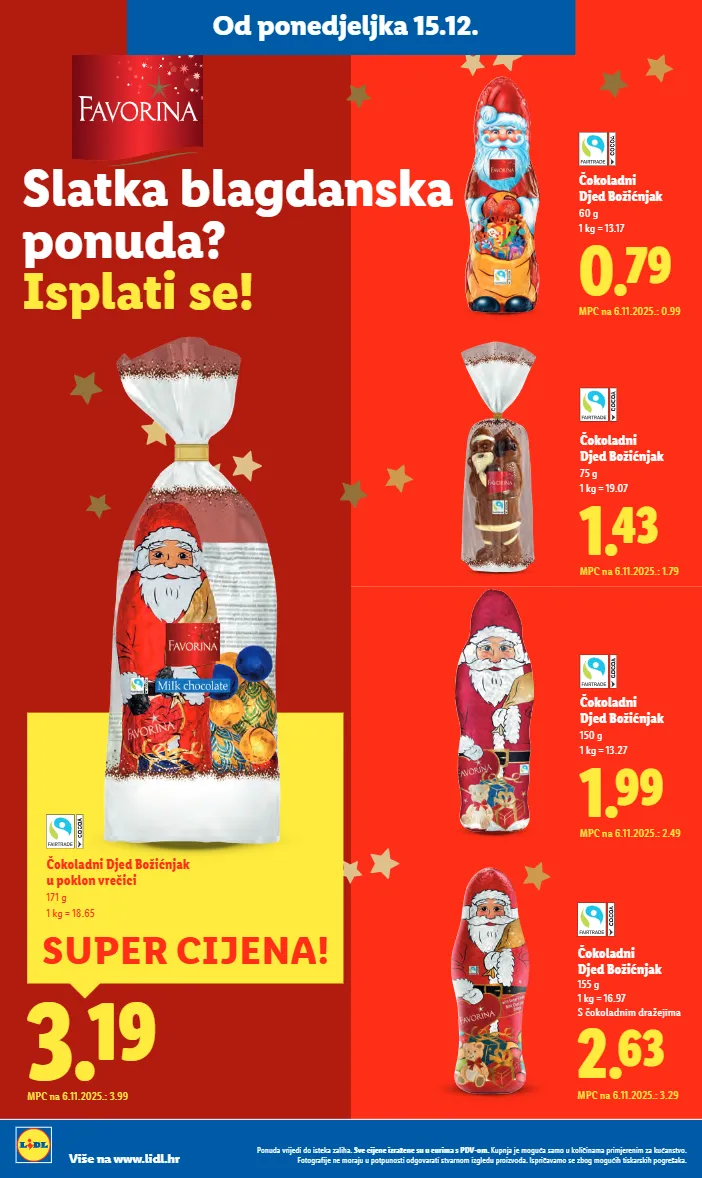3.19 MPC na 6.11.2025.: 3.99 SUPER CIJENA! Čokoladni Djed Božićnjak u poklon vrečici 171 g 1 kg = 18.65 2.63 MPC na 6.11.2025.: 3.29 Čokoladni Djed Božićnjak 155 g 1 kg = 16.97 S čokoladnim dražejima 1.99 MPC na 6.11.2025.: 2.49 Čokoladni Djed Božićnjak 150 g 1 kg = 13.27 0.79 MPC na 6.11.2025.: 0.99 Čokoladni Djed Božićnjak 60 g 1 kg = 13.17 1.43 MPC na 6.11.2025.: 1.79 Čokoladni Djed Božićnjak 75 g 1 kg = 19.07 Slatka blagdanska ponuda? Isplati se! Od ponedjeljka 15.12. Ponuda vrijedi do isteka zaliha. Sve cijene izražene su u eurima s PDV-om. Kupnja je moguća samo u količinama primjerenim za kućanstvo. Fotografije ne moraju u potpunosti odgovarati stvarnom izgledu proizvoda. Ispričavamo se zbog mogućih tiskarskih pogrešaka. Više na www.lidl.hr