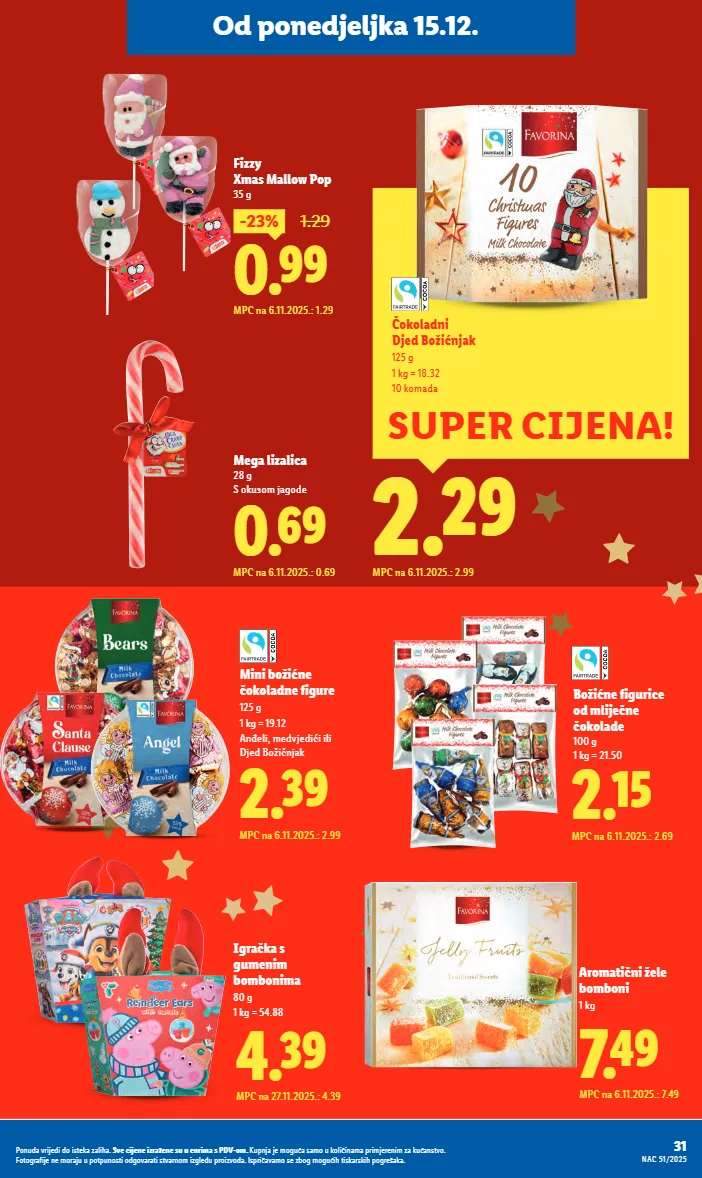 2.29 mpc na 6.11.2025.: 2.99 super cijena! čokoladni djed božićnjak 125 g 1 kg = 18.32 10 komada 2.15 mpc na 6.11.2025.: 2.69 božićne figurice od mliječne čokolade 100 g 1 kg = 21.50 fizzy xmas mallow pop 35 g 0.69 mpc na 6.11.2025.: 0.69 mega lizalica 28 g s okusom jagode 2.39 mpc na 6.11.2025.: 2.99 mini božićne čokoladne figure 125 g 1 kg = 19.12 anđeli, medvjedići ili djed božičnjak 4.39 mpc na 27.11.2025.: 4.39 igračka s gumenim bombonima 80 g 1 kg = 54.88 aromatični žele bomboni 1 kg 7.49 mpc na 6.11.2025.: 7.49 0.99 -23% 1.29 mpc na 6.11.2025.: 1.29 31 nac 51/2025 ponuda vrijedi do isteka zaliha. sve cijene izražene su u eurima s pdv-om. kupnja je moguća samo u količinama primjerenim za kućanstvo. fotografije ne moraju u potpunosti odgovarati stvarnom izgledu proizvoda. ispričavamo se zbog mogućih tiskarskih pogrešaka. od ponedjeljka 15.12.