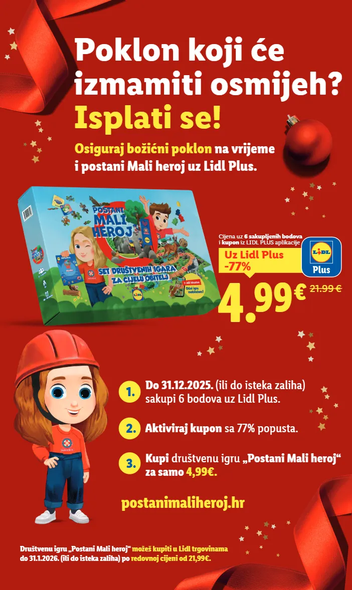 Osiguraj božićni poklon na vrijeme i postani Mali heroj uz Lidl Plus. Društvenu igru „Postani Mali heroj“ možeš kupiti u Lidl trgovinama do 31.1.2026. (ili do isteka zaliha) po redovnoj cijeni od 21,99€. 3. Kupi društvenu igru „Postani Mali heroj“ za samo 4,99€. postanimaliheroj.hr 1. Do 31.12.2025. (ili do isteka zaliha) sakupi 6 bodova uz Lidl Plus. 2. Aktiviraj kupon sa 77% popusta. Poklon koji će izmamiti osmijeh? Isplati se! Cijena uz 6 sakupljenih bodova i kupon iz LIDL PLUS aplikacije 4. 99 21.99 € -77% Uz Lidl Plus €