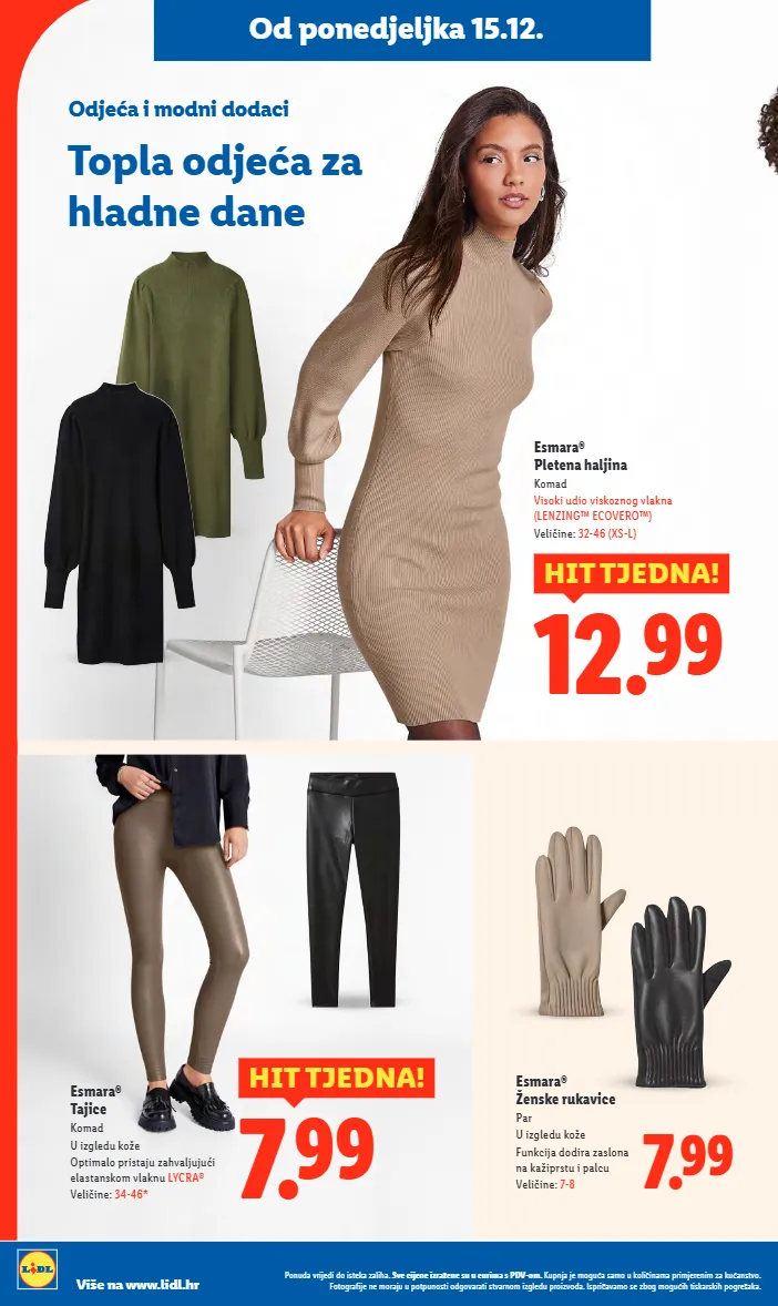 od ponedjeljka 10.11. od ponedjeljka 15.12. topla odjeća za hladne dane odjeća i modni dodaci esmara® pletena haljina komad visoki udio viskoznog vlakna (lenzing™ ecovero™) veličine: 32-46 (xs-l) 12.99 hit tjedna! esmara® tajice komad u izgledu kože optimalo pristaju zahvaljujući elastanskom vlaknu lycra® veličine: 34-46* 7.99 hit tjedna! 7.99 esmara® ženske rukavice par u izgledu kože funkcija dodira zaslona na kažiprstu i palcu veličine: 7-8 ponuda vrijedi do isteka zaliha. sve cijene izražene su u eurima s pdv-om. kupnja je moguća samo u količinama primjerenim za kućanstvo. fotografije ne moraju u potpunosti odgovarati stvarnom izgledu proizvoda. ispričavamo se zbog mogućih tiskarskih pogrešaka. više na www.lidl.hr