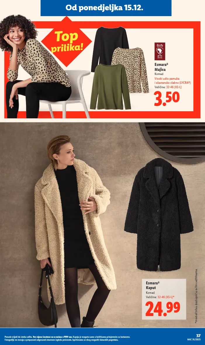 od ponedjeljka 15.12. top prilika ! *modeli nisu dostupni u svim veličinama 24.99 esmara® kaput komad veličine: 32-46 (xs-l)* 3.50 esmara® majica komad visoki udio pamuka i elastansko vlakno (lycra®) veličine: 32-46 (xs-l) 37 nac 51/2025 ponuda vrijedi do isteka zaliha. sve cijene izražene su u eurima s pdv-om. kupnja je moguća samo u količinama primjerenim za kućanstvo. fotografije ne moraju u potpunosti odgovarati stvarnom izgledu proizvoda. ispričavamo se zbog mogućih tiskarskih pogrešaka.