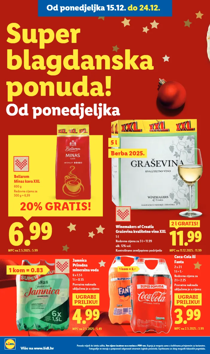 4.99 ugrabi priliku! mpc na 2.5.2025.: 5.49 jamnica prirodna mineralna voda 6 x 1.5 l 1 l = 0.55 povratna naknada uključena je u cijenu 6.99 mpc na 2.5.2025.: 5.99 20% gratis! bellarom minas kava xxl 600 g redovna cijena za 500 g = 6,99 coca-cola ili fanta 2 x 2 l 1 l = 1.- redovna cijena za 2 l = 2.25 povratna naknada uključena je u cijenu 3.99 ugrabi priliku! mpc na 2.5.2025.: 3.99 winemakers of croatia graševina kvalitetno vino xxl 5 l redovna cijena za 3 l = 11.99 alk. 12% vol. kontrolirano zemljopisno podrijetlo 11.99 2 l gratis! mpc na 11.12.2025.: 11.99 super blagdanska ponuda! od ponedjeljka 1 kom = 2.- berba 2025. 5 l 1 kom = 0.83 ponuda vrijedi do isteka zaliha. sve cijene izražene su u eurima s pdv-om. kupnja je moguća samo u količinama primjerenim za kućanstvo. fotografije ne moraju u potpunosti odgovarati stvarnom izgledu proizvoda. ispričavamo se zbog mogućih tiskarskih pogrešaka. više na www.lidl.hr od ponedjeljka 15.12. do 24.12.