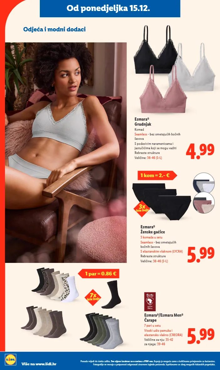1 kom = 2.- € 7x iste boje od ponedjeljka 15.12. odjeća i modni dodaci esmara® grudnjak komad seamless - bez ometajućih bočnih šavova s podesivim naramenicama i jastučićima koji se mogu vaditi rebraste strukture veličine: 36-46 (s-l) 4.99 esmara® ženske gaćice 3 komada u setu seamless - bez ometajućih bočnih šavova s elastanskim vlaknom (lycra) rebraste strukture veličine: 36-46 (s-l) 5.99 1 par = 0.86 € esmara®/esmara men® čarape 7 pari u setu visoki udio pamuka i elastansko vlakno (creora) veličine za nju: 35-42 za njega: 39-46 5.99 3x iste boje ponuda vrijedi do isteka zaliha. sve cijene izražene su u eurima s pdv-om. kupnja je moguća samo u količinama primjerenim za kućanstvo. fotografije ne moraju u potpunosti odgovarati stvarnom izgledu proizvoda. ispričavamo se zbog mogućih tiskarskih pogrešaka. više na www.lidl.hr