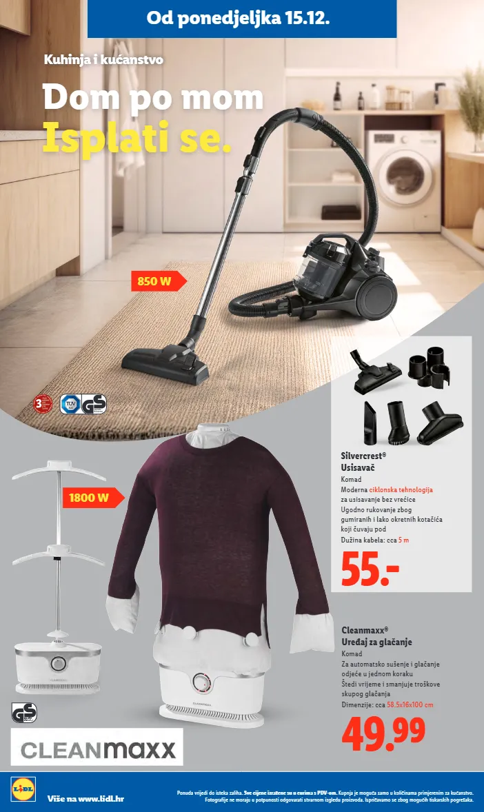 od ponedjeljka 15.12. dom po mom isplati se. kuhinja i kućanstvo cleanmaxx® uređaj za glačanje komad za automatsko sušenje i glačanje odjeće u jednom koraku štedi vrijeme i smanjuje troškove skupog glačanja dimenzije: cca 58.5x16x100 cm 49.99 55.- silvercrest® usisavač komad moderna ciklonska tehnologija za usisavanje bez vrećice ugodno rukovanje zbog gumiranih i lako okretnih kotačića koji čuvaju pod dužina kabela: cca 5 m 1800 w 850 w ponuda vrijedi do isteka zaliha. sve cijene izražene su u eurima s pdv-om. kupnja je moguća samo u količinama primjerenim za kućanstvo. fotografije ne moraju u potpunosti odgovarati stvarnom izgledu proizvoda. ispričavamo se zbog mogućih tiskarskih pogrešaka. više na www.lidl.hr