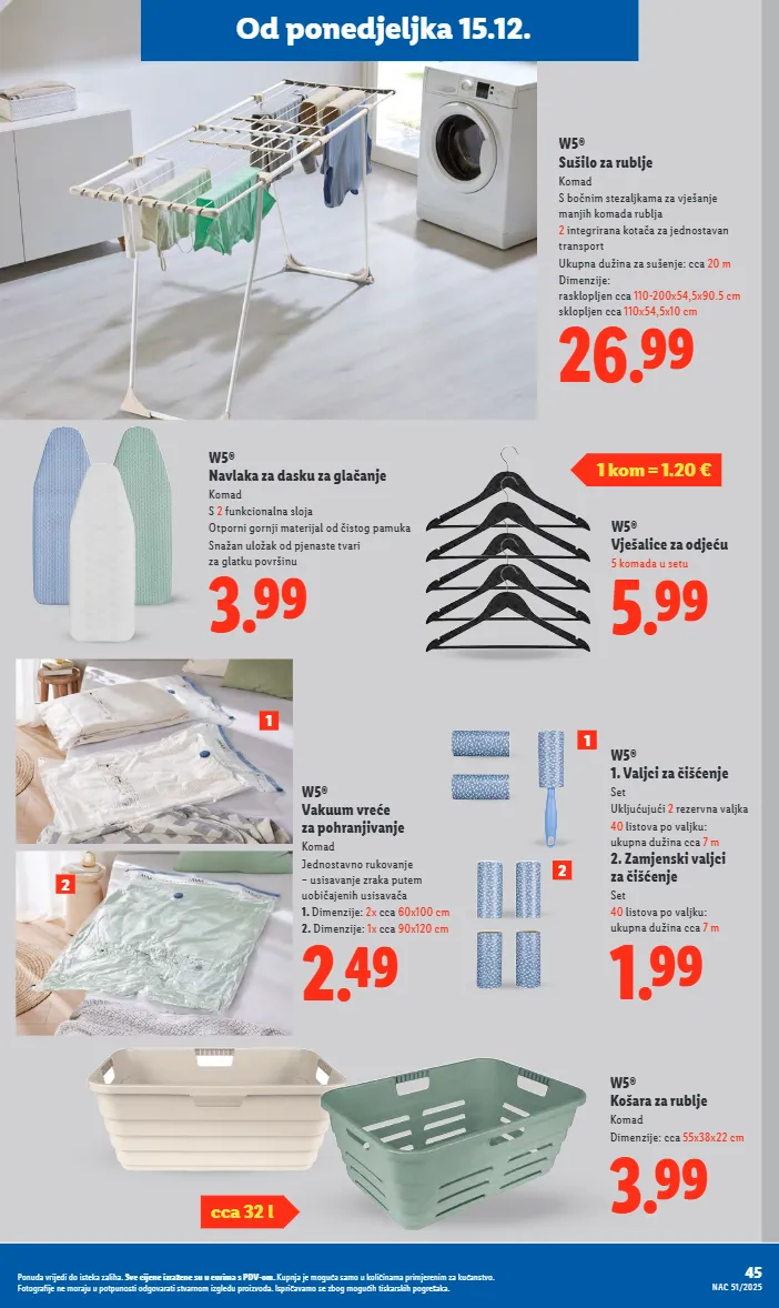 od ponedjeljka 15.12. w5® sušilo za rublje komad s bočnim stezaljkama za vješanje manjih komada rublja 2 integrirana kotača za jednostavan transport ukupna dužina za sušenje: cca 20 m dimenzije: rasklopljen cca 110-200x54,5x90.5 cm sklopljen cca 110x54,5x10 cm 26.99 w5® košara za rublje komad dimenzije: cca 55x38x22 cm 3.99 w5® vješalice za odjeću 5 komada u setu 5.99 1 kom = 1.20 € 3.99 w5® navlaka za dasku za glačanje komad s 2 funkcionalna sloja otporni gornji materijal od čistog pamuka snažan uložak od pjenaste tvari za glatku površinu 1 2 w5® 1. valjci za čišćenje set ukljućujući 2 rezervna valjka 40 listova po valjku: ukupna dužina cca 7 m 2. zamjenski valjci za čišćenje set 40 listova po valjku: ukupna dužina cca 7 m 1.99 2.49 w5® vakuum vreće za pohranjivanje komad jednostavno rukovanje – usisavanje zraka putem uobičajenih usisavača 1. dimenzije: 2x cca 60x100 cm 2. dimenzije: 1x cca 90x120 cm cca 32 l 1 2 45 nac 51/2025 ponuda vrijedi do isteka zaliha. sve cijene izražene su u eurima s pdv-om. kupnja je moguća samo u količinama primjerenim za kućanstvo. fotografije ne moraju u potpunosti odgovarati stvarnom izgledu proizvoda. ispričavamo se zbog mogućih tiskarskih pogrešaka.
