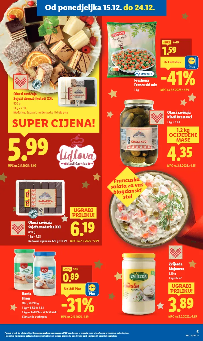 5.99 mpc na 2.5.2025.: 5.99 super cijena! okusi zavičaja svježi domaći kolači xxl 820 g 1 kg = 7.30 mađarica, čupavci, medena pita i bijela pita 3.89 ugrabi priliku! mpc na 2.5.2025.: 4.99 6.19 ugrabi priliku! mpc na 2.5.2025.: 5.99 okusi zavičaja svježa mađarica xxl 850 g 1 kg = 7.28 redovna cijena za 420 g = 4.99 okusi zavičaja kiseli krastavci 1 kg = 3.63 4.35 1.2 kg ocijeđene mase mpc na 2.5.2025.: 4.35 zvijezda majoneza 620 g 1 kg = 6.27 -41% uz lidl plus 1.59 -36% 2.49 mpc na 2.5.2025.: 2.39 freshona francuski mix 1 kg francuska salata za vaš blagdanski stol -31% uz lidl plus 0.89 -25% 1.19 mpc na 2.5.2025.: 1.19 kania hren 185 g ili 190 g 1 kg = 4.68 ili 4.81 1 kg uz lidl plus: 4.32 ili 4.43 classic ili s vrhnjem 5 nac 51/2025 ponuda vrijedi do isteka zaliha. sve cijene izražene su u eurima s pdv-om. kupnja je moguća samo u količinama primjerenim za kućanstvo. fotografije ne moraju u potpunosti odgovarati stvarnom izgledu proizvoda. ispričavamo se zbog mogućih tiskarskih pogrešaka. od ponedjeljka 15.12. do 24.12.