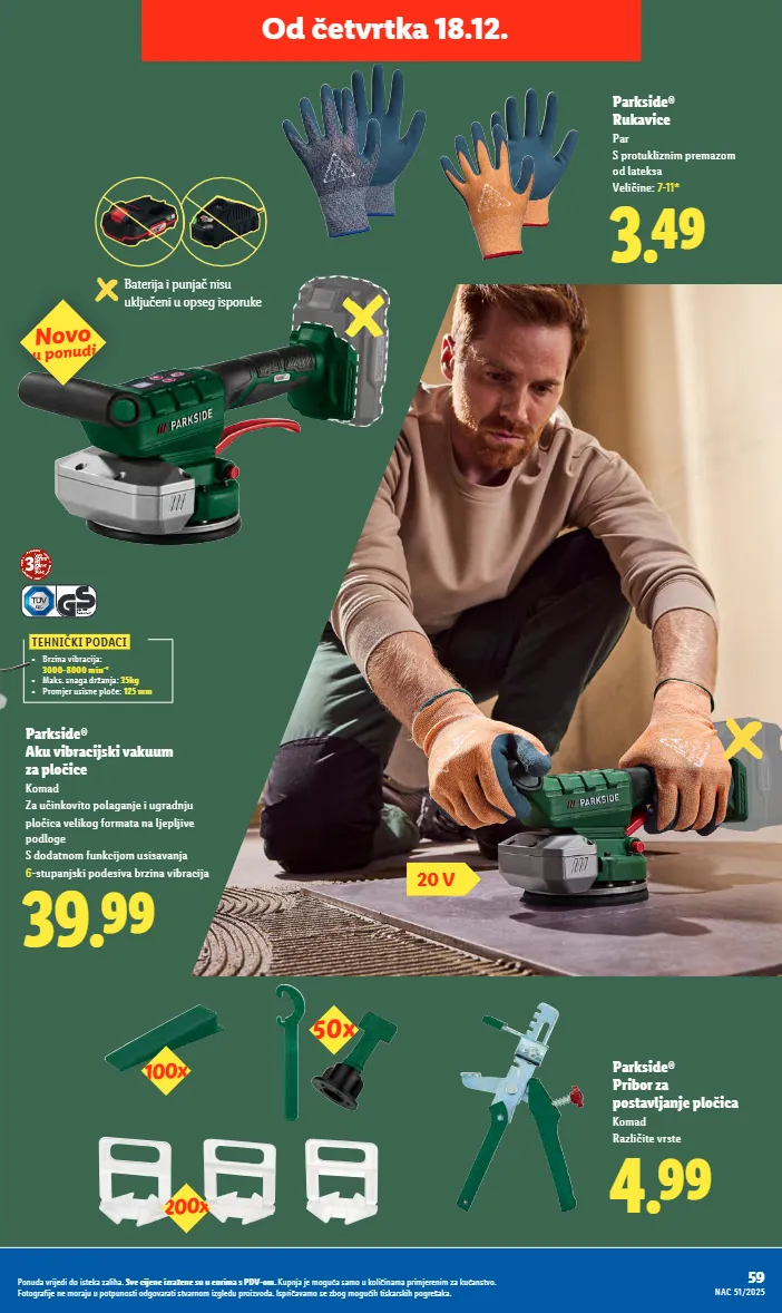 od četvrtka 18.12. 39.99 parkside ® aku vibracijski vakuum za pločice komad za učinkovito polaganje i ugradnju pločica velikog formata na ljepljive podloge s dodatnom funkcijom usisavanja 6 -stupanjski podesiva brzina vibracija baterija i punjač nisu uključeni u opseg isporuke tehnički podaci • brzina vibracija: 3000-8000 min –1 • maks. snaga držanja: 35kg • promjer usisne ploče: 125 mm 20 v 4.99 parkside ® pribor za postavljanje pločica komad različite vrste 3.49 parkside ® rukavice par s protukliznim premazom od lateksa veličine: 7-11* 100x novo u ponudi 200x 50x 59 nac 51/2025 ponuda vrijedi do isteka zaliha. sve cijene izražene su u eurima s pdv-om. kupnja je moguća samo u količinama primjerenim za kućanstvo. fotografije ne moraju u potpunosti odgovarati stvarnom izgledu proizvoda. ispričavamo se zbog mogućih tiskarskih pogrešaka.