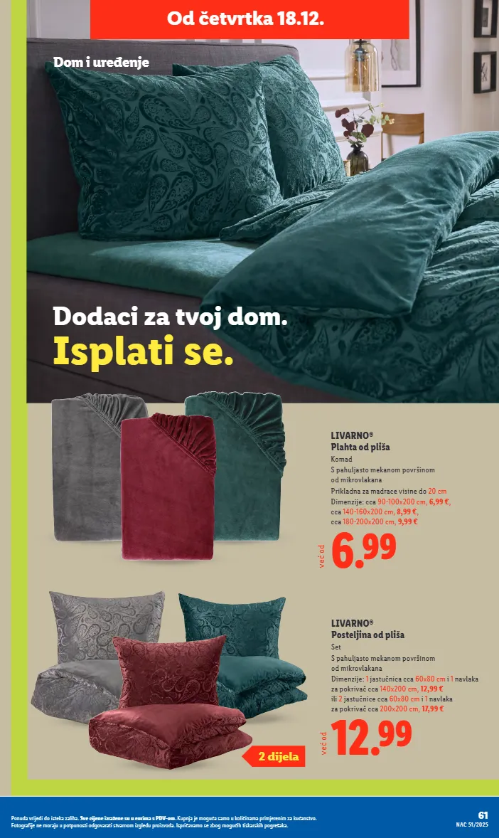 dom i uređenje 12.99 livarno® posteljina od pliša set s pahuljasto mekanom površinom od mikrovlakana dimenzije: 1 jastučnica cca 60x80 cm i 1 navlaka za pokrivač cca 140x200 cm, 12,99 € ili 2 jastučnice cca 60x80 cm i 1 navlaka za pokrivač cca 200x200 cm, 17,99 € 2 dijela 6.99 livarno® plahta od pliša komad s pahuljasto mekanom površinom od mikrovlakana prikladna za madrace visine do 20 cm dimenzije: cca 90-100x200 cm, 6,99 € , cca 140-160x200 cm, 8,99 € , cca 180-200x200 cm, 9,99 € već od već od od četvrtka 18.12. dodaci za tvoj dom. isplati se. 61 nac 51/2025 ponuda vrijedi do isteka zaliha. sve cijene izražene su u eurima s pdv-om. kupnja je moguća samo u količinama primjerenim za kućanstvo. fotografije ne moraju u potpunosti odgovarati stvarnom izgledu proizvoda. ispričavamo se zbog mogućih tiskarskih pogrešaka.