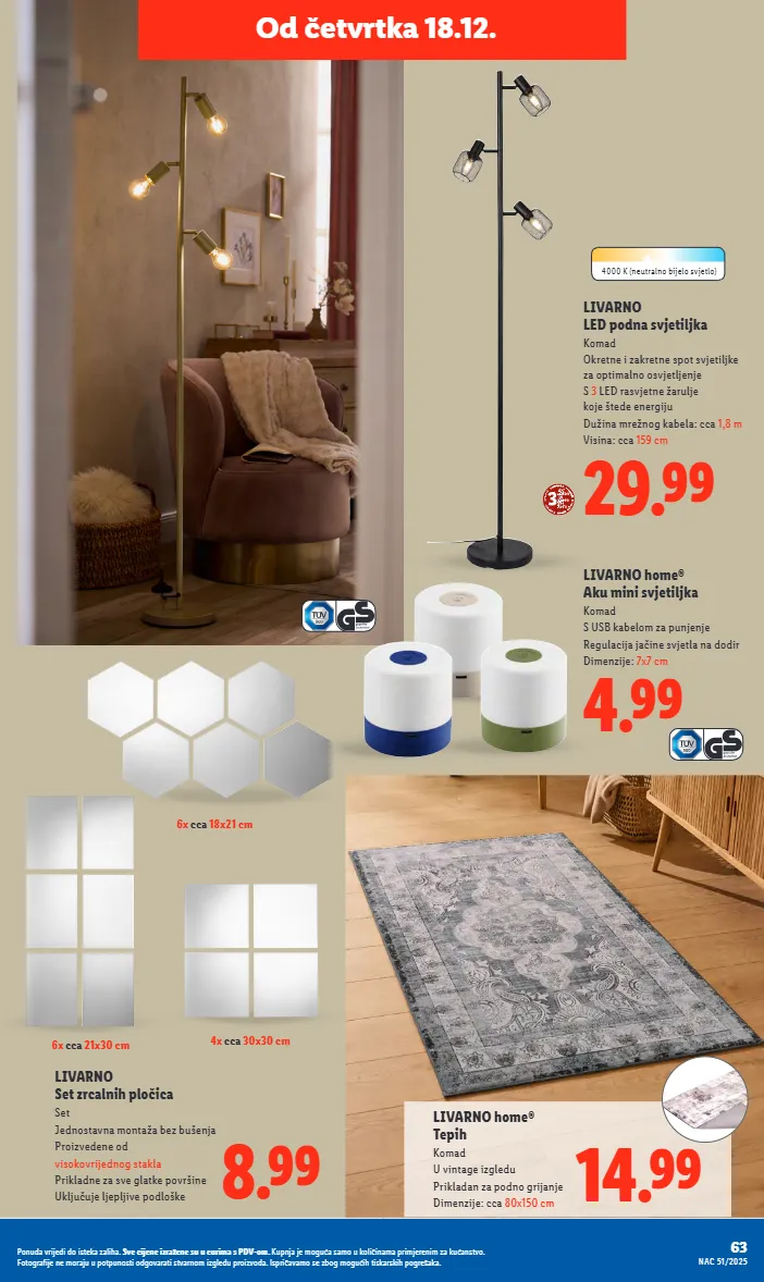 od četvrtka 18.12. livarno home® aku mini svjetiljka komad s usb kabelom za punjenje regulacija jačine svjetla na dodir dimenzije: 7x7 cm 4.99 4000 k (neutralno bijelo svjetlo) 4x cca 30x30 cm 6x cca 21x30 cm 6x cca 18x21 cm livarno home® tepih komad u vintage izgledu prikladan za podno grijanje dimenzije: cca 80x150 cm 14.99 livarno led podna svjetiljka komad okretne i zakretne spot svjetiljke za optimalno osvjetljenje s 3 led rasvjetne žarulje koje štede energiju dužina mrežnog kabela: cca 1,8 m visina: cca 159 cm 29.99 8.99 livarno set zrcalnih pločica set jednostavna montaža bez bušenja proizvedene od visokovrijednog stakla prikladne za sve glatke površine uključuje ljepljive podloške 63 nac 51/2025 ponuda vrijedi do isteka zaliha. sve cijene izražene su u eurima s pdv-om. kupnja je moguća samo u količinama primjerenim za kućanstvo. fotografije ne moraju u potpunosti odgovarati stvarnom izgledu proizvoda. ispričavamo se zbog mogućih tiskarskih pogrešaka.