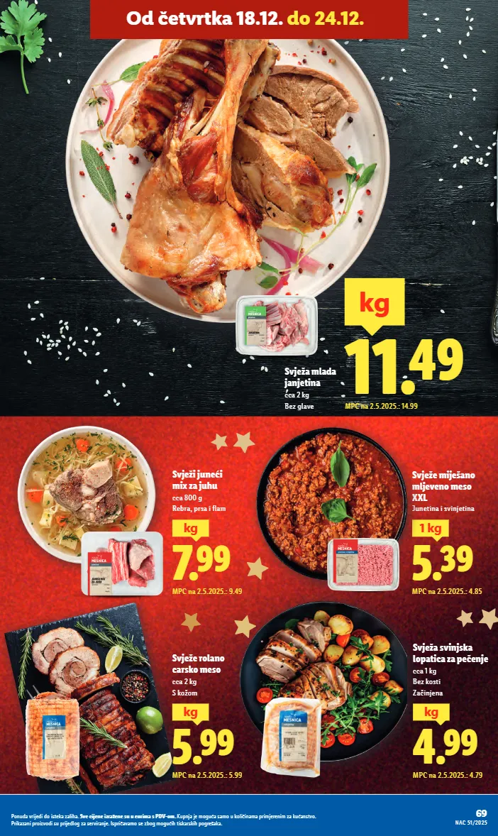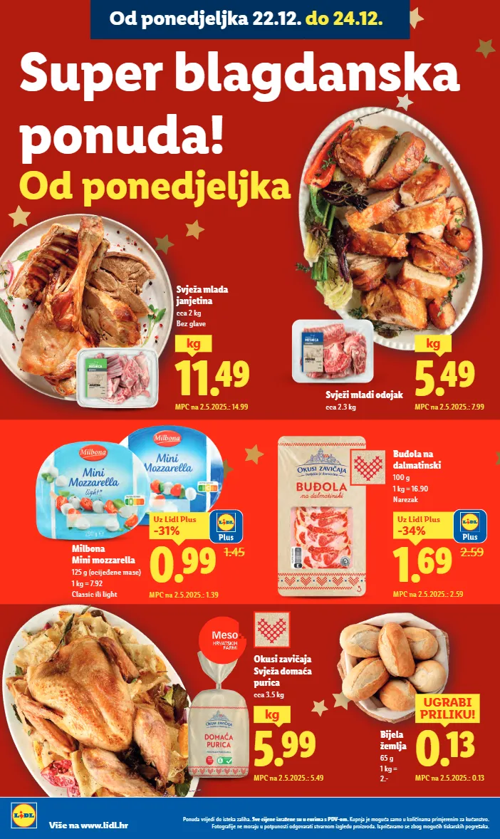 5.99 kg mpc na 2.5.2025.: 5.49 okusi zavičaja svježa domaća purica cca 3.5 kg 0.13 ugrabi priliku! mpc na 2.5.2025.: 0.13 bijela žemlja 65 g 1 kg = 2.- milbona mini mozzarella 125 g (ocijeđene mase) 1 kg = 7.92 classic ili light 1.45 0.99 -31% uz lidl plus mpc na 2.5.2025.: 1.39 buđola na dalmatinski 100 g 1 kg = 16.90 narezak 2.59 1.69 -34% uz lidl plus mpc na 2.5.2025.: 2.59 super blagdanska ponuda! od ponedjeljka svježi mladi odojak cca 2.3 kg 5.49 kg mpc na 2.5.2025.: 7.99 11.49 kg mpc na 2.5.2025.: 14.99 svježa mlada janjetina cca 2 kg bez glave ponuda vrijedi do isteka zaliha. sve cijene izražene su u eurima s pdv-om. kupnja je moguća samo u količinama primjerenim za kućanstvo. fotografije ne moraju u potpunosti odgovarati stvarnom izgledu proizvoda. ispričavamo se zbog mogućih tiskarskih pogrešaka. više na www.lidl.hr od ponedjeljka 22.12. do 24.12.