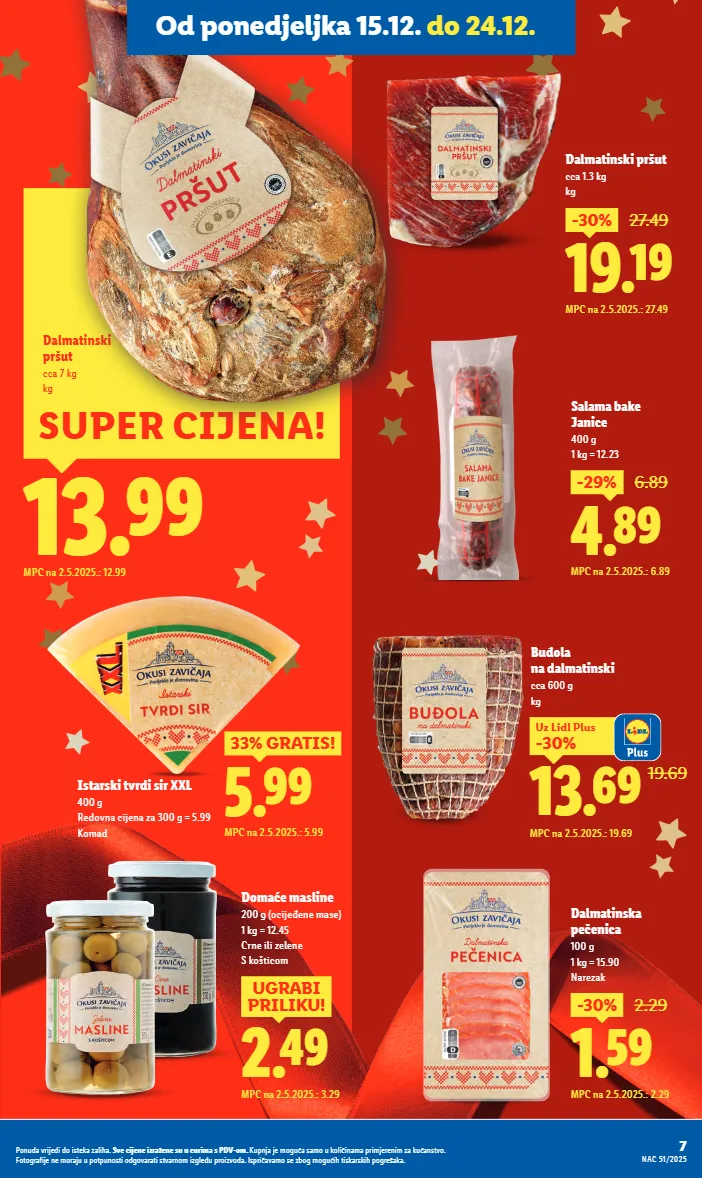 dalmatinska pečenica 100 g 1 kg = 15.90 narezak 1.59 -30% 2.29 mpc na 2.5.2025.: 2.29 4.89 -29% 6.89 mpc na 2.5.2025.: 6.89 salama bake janice 400 g 1 kg = 12.23 13.99 mpc na 2.5.2025.: 12.99 super cijena! dalmatinski pršut cca 7 kg kg 19.69 13.69 -30% uz lidl plus mpc na 2.5.2025.: 19.69 5.99 33% gratis! mpc na 2.5.2025.: 5.99 istarski tvrdi sir xxl 400 g redovna cijena za 300 g = 5.99 komad 2.49 ugrabi priliku! mpc na 2.5.2025.: 3.29 domaće masline 200 g (ocijeđene mase) 1 kg = 12.45 crne ili zelene s košticom buđola na dalmatinski cca 600 g kg dalmatinski pršut cca 1.3 kg kg 19.19 -30% 27.49 mpc na 2.5.2025.: 27.49 7 nac 51/2025 ponuda vrijedi do isteka zaliha. sve cijene izražene su u eurima s pdv-om. kupnja je moguća samo u količinama primjerenim za kućanstvo. fotografije ne moraju u potpunosti odgovarati stvarnom izgledu proizvoda. ispričavamo se zbog mogućih tiskarskih pogrešaka. od ponedjeljka 15.12. do 24.12.