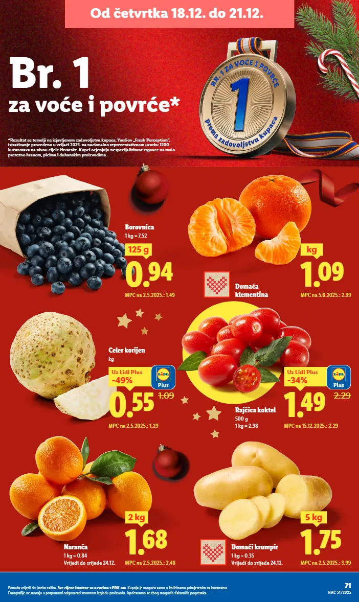 br. 1 za voće i povrće* *rezultat se temelji na izjavljenom zadovoljstvu kupaca. yougov „fresh perception”, istraživanje provedeno u veljači 2025. na nacionalno reprezentativnom uzorku 1200 kućanstava na nivou cijele hrvatske. kupci ocjenjuju nespecijalizirane trgovce na malo pretežno hranom, pićima i duhanskim proizvodima. od četvrtka 18.12. do 21.12. domaća klementina 1.09 kg mpc na 5.6.2025.: 2.99 mpc na 15.12.2025.: 2.29 2.29 1.49 -34% uz lidl plus rajčica koktel 500 g 1 kg = 2.98 borovnica 1 kg = 7.52 0.94 125 g mpc na 2.5.2025.: 1.49 71 nac 51/2025 ponuda vrijedi do isteka zaliha. sve cijene izražene su u eurima s pdv-om. kupnja je moguća samo u količinama primjerenim za kućanstvo. fotografije ne moraju u potpunosti odgovarati stvarnom izgledu proizvoda. ispričavamo se zbog mogućih tiskarskih pogrešaka. mpc na 2.5.2025.: 1.29 1.09 0.55 -49% uz lidl plus celer korijen kg naranča 1 kg = 0.84 vrijedi do srijede 24.12. 1.68 2 kg mpc na 2.5.2025.: 2.48 1.75 5 kg mpc na 2.5.2025.: 3.99 domaći krumpir 1 kg = 0.35 vrijedi do srijede 24.12.