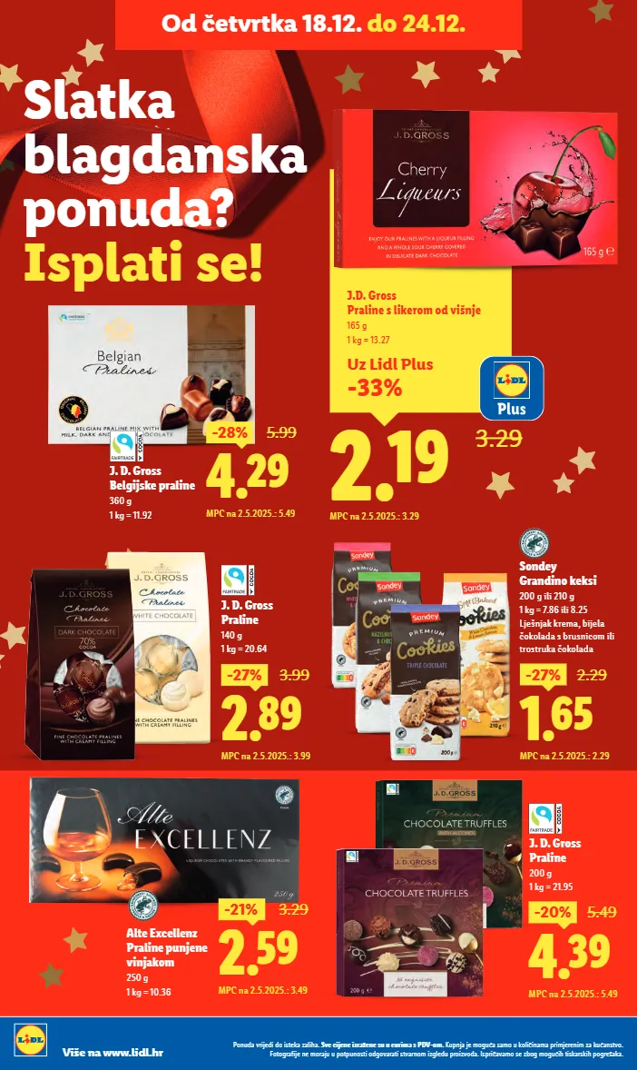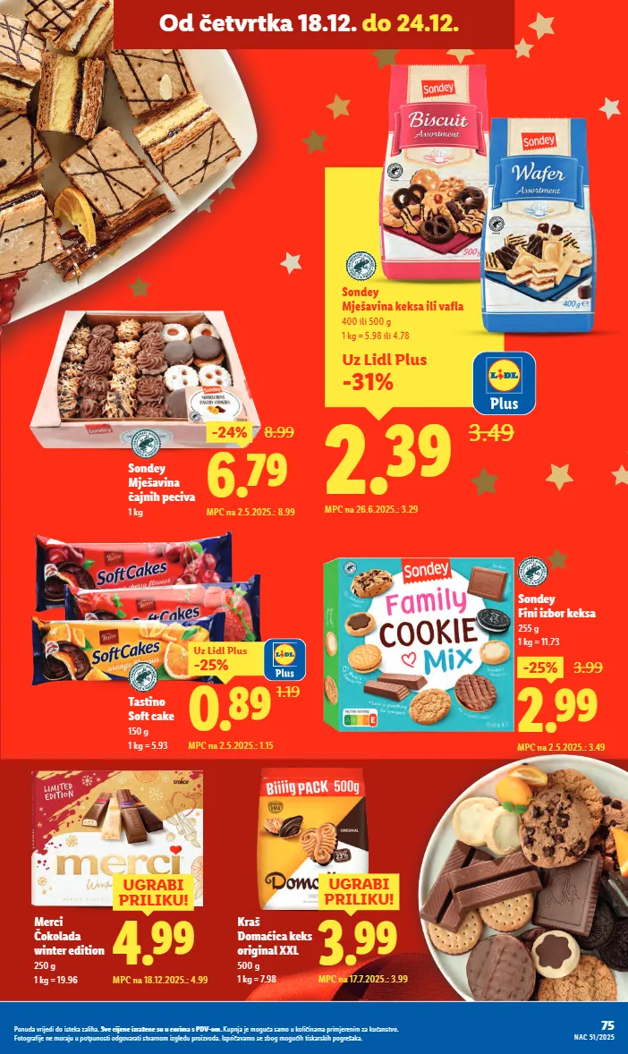 6.79 -24% 8.99 MPC na 2.5.2025.: 8.99 Sondey Mješavina čajnih peciva 1 kg 3.99 UGRABI PRILIKU! MPC na 17.7.2025.: 3.99 Kraš Domaćica keks original XXL 500 g 1 kg = 7.98 Tastino Soft cake 150 g 1 kg = 5.93 1.19 0.89 -25% Uz Lidl Plus MPC na 2.5.2025.: 1.15 Uz Lidl Plus -31% 2.39 3.49 Sondey Mješavina keksa ili vafla 400 ili 500 g 1 kg = 5.98 ili 4.78 MPC na 26.6.2025.: 3.29 4.99 UGRABI PRILIKU! MPC na 18.12.2025.: 4.99 Merci Čokolada winter edition 250 g 1 kg = 19.96 2.99 -25% 3.99 MPC na 2.5.2025.: 3.49 Sondey Fini izbor keksa 255 g 1 kg = 11.73 75 NAC 51/2025 Ponuda vrijedi do isteka zaliha. Sve cijene izražene su u eurima s PDV-om. Kupnja je moguća samo u količinama primjerenim za kućanstvo. Fotografije ne moraju u potpunosti odgovarati stvarnom izgledu proizvoda. Ispričavamo se zbog mogućih tiskarskih pogrešaka. Od četvrtka 18.12. do 24.12.