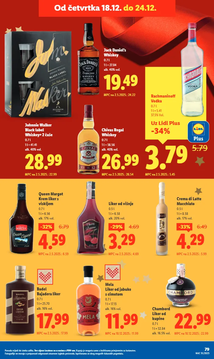 17.99 mpc na 2.5.2025.: 17.99 badel bajadera liker 0.7 l 1 l = 25.70 alk. 16% vol. 11.99 mpc na 18.12.2025.: 11.99 mela liker od jabuke s cimetom 0.7 l 1 l = 17.13 alk. 16% vol. 22.99 mpc na 18.12.2025.: 22.99 chambord liker od kupine 0.7 l 1 l = 32.84 alk. 16.5% vol. 4.59 -32% 6.79 mpc na 2.5.2025.: 6.59 queen margot krem liker s viskijem 0.7 l 1 l = 6.56 alk. 17% vol. 28.99 mpc na 2.5.2025.: 22.99 johnnie walker black label whiskey+ 2 čaše 0.7 l 1 l = 41.41 alk. 40% vol. 19.49 mpc na 2.5.2025.: 24.22 jack daniel’s whiskey 0.7 l 1 l = 27.84 alk. 40% vol. 3.29 -29% 4.69 mpc na 2.5.2025.: 4.69 liker od višnje 0.5 l 1 l = 6.58 alk. 20% vol. 4.29 -33% 6.49 mpc na 2.5.2025.: 5.99 crema di latte macchiato 0.5 l 1 l = 8.58 alk. 17% vol. 26.99 mpc na 2.5.2025.: 26.54 chivas regal whiskey 0.7 l 1 l = 38.56 alk. 40% vol. uz lidl plus -34% 3.79 5.79 rachmaninoff vodka 0.7 l 1 l = 5.41 37.5% vol. mpc na 2.5.2025.: 5.45 79 nac 51/2025 ponuda vrijedi do isteka zaliha. sve cijene izražene su u eurima s pdv-om. kupnja je moguća samo u količinama primjerenim za kućanstvo. fotografije ne moraju u potpunosti odgovarati stvarnom izgledu proizvoda. ispričavamo se zbog mogućih tiskarskih pogrešaka. od četvrtka 18.12. do 24.12.