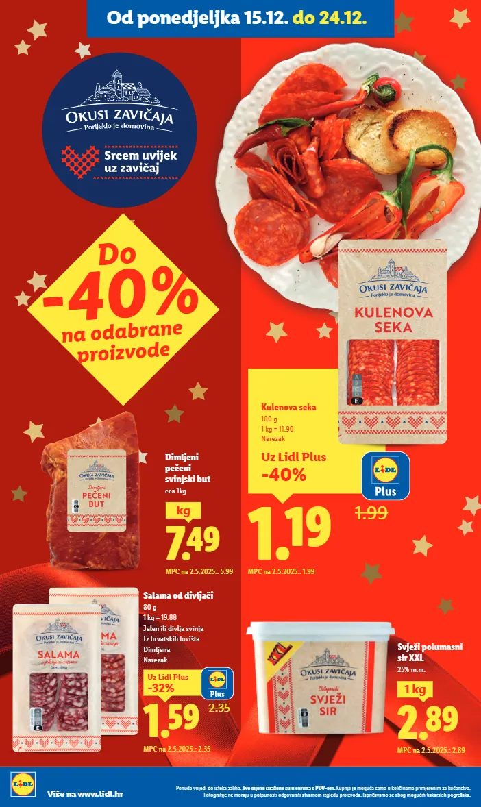 okusi zavičaja domaći mlinci 250 g 1 kg = 1.84 0.46 -53% 0.99 mpc na 2.5.2025.: 0.99 5.99 kg mpc na 2.5.2025.: 5.49 okusi zavičaja svježa domaća purica cca 3.5 kg izdanje 51/2025 ponuda vrijedi do isteka zaliha. sve cijene izražene su u eurima s pdv-om. kupnja je moguća samo u količinama primjerenim za kućanstvo. prikazani proizvodi su prijedlog za serviranje. ispričavamo se zbog mogućih tiskarskih pogrešaka. više na www.lidl.hr od ponedjeljka 15.12. do 24.12. okusi zavičaja pršut 500 g 1 kg = 15.78 narezak -41% uz lidl plus 1.59 -36% 2.49 mpc na 2.5.2025.: 2.39 freshona francuski mix 1 kg super blagdanska ponuda za radostan božić? isplati se! 7.89 -41% 13.49 mpc na 2.5.2025.: 9.99 domaća jabuka crvena sorta: gala vrijedi do srijede 17.12. 1.29 kg mpc na 11.8.2025.: 1.79 5.49 kg mpc na 2.5.2025.: 7.99 svježi mladi odojak cca 2.3 kg