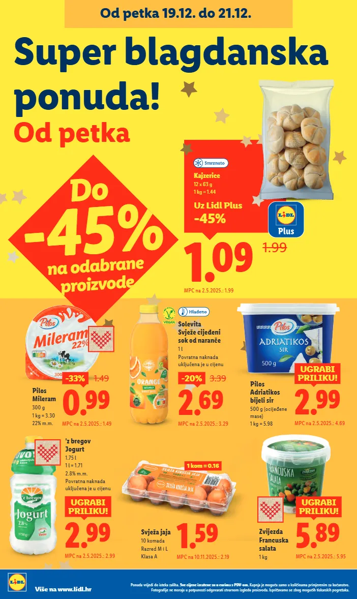 do -45% na odabrane proizvode 'z bregov jogurt 1.75 l 1 l = 1.71 2.8% m.m. povratna naknada uključena je u cijenu 2.99 ugrabi priliku! mpc na 2.5.2025.: 2.99 5.89 ugrabi priliku! mpc na 2.5.2025.: 5.95 zvijezda francuska salata 1 kg 0.99 -33% 1.49 mpc na 2.5.2025.: 1.49 pilos mileram 300 g 1 kg = 3.30 22% m.m. pilos adriatikos bijeli sir 500 g (ocijeđene mase) 1 kg = 5.98 uz lidl plus -45% 1.09 1.99 kajzerice 12 x 63 g 1 kg = 1.44 mpc na 2.5.2025.: 1.99 solevita svježe cijeđeni sok od naranče 1 l povratna naknada uključena je u cijenu 2.69 -20% 3.39 mpc na 2.5.2025.: 3.29 1.59 mpc na 10.11.2025.: 2.19 svježa jaja 10 komada razred m i l klasa a 2.99 ugrabi priliku! mpc na 2.5.2025.: 4.69 1 kom = 0.16 super blagdanska ponuda! od petka od petka 19.12. do 21.12. ponuda vrijedi do isteka zaliha. sve cijene izražene su u eurima s pdv-om. kupnja je moguća samo u količinama primjerenim za kućanstvo. fotografije ne moraju u potpunosti odgovarati stvarnom izgledu proizvoda. ispričavamo se zbog mogućih tiskarskih pogrešaka. više na www.lidl.hr